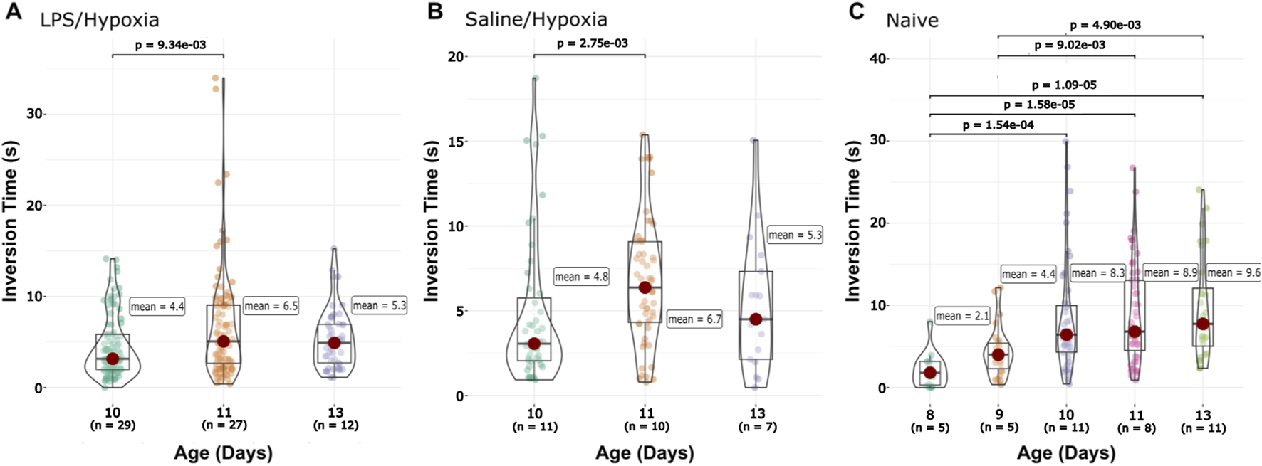 The inversion test showed shorter flip times with increasing age. There were significant differences in flip time with increased ages of the LPS/Hypoxia, Naive, and Saline/Hypoxia animals (Kruskal–Wallis with Dunn pairwise test). The LPS/Hypoxia group showed a significant difference between P10 and P11 (2.2 ± 4.5 vs. 1.6 ± 1.6, p-value = 1.22 × 10−6) and P11 and P13 (1.6 ± 1.6 vs. 1.1 ± 0.7, p-value = 1.55 × 10−3). The Naïve group showed significant differences across: P8 and P9 (2.3 ± 1.7 vs. 1.2 ± 0.6, p-value = 4.55 × 10−8), P9 and P10 (1.2 ± 0.6 vs. 3.6 ± 6.8, p-value = 5.47 × 10−4), P10 and P11 (3.6 ± 6.8 vs. 1.8 ± 2.1, p-value = 2.05 × 10−3). Finally, there were significant differences when comparing the Saline/Hypoxia group at ages P10 and P11 (2.2 ± 4.5 vs. 1.6 ± 1.6, p-value = 3.55 × 10−3) and P11 to P13 (1.6 ± 1.6 vs. 1.1 ± 0.7, p-value = 2.63 × 10−3) (Supplementary Figure S3). We did not observe differences in general trends between the groups the improvement of flip time correlates with increased animal age (Supplementary Figure S4). We also wanted to look at the differences between the groups at different ages. At P10 we observed significant differences between the Saline/Hypoxia and LPS/Hypoxia (1.4 ± 1.1 vs. 2.2 ± 4.5, p-value = 4.15 × 10−5) and Naive (1.4 ± 1.1 vs. 3.6 ± 6.8, p-value = 3.82 × 10−5) groups. At P11 we observed differences between: LPS/Hypoxia and Saline/Hypoxia (1.6 ± 1.6 vs. 2.2 ± 2.8, p-value = 1.40 × 10−3), Naïve and Saline/Hypoxia (1.8 ± 2.1 vs. 2.2 ± 2.8, p-value = 1.81 × 10−3), (Supplementary Figure S3).