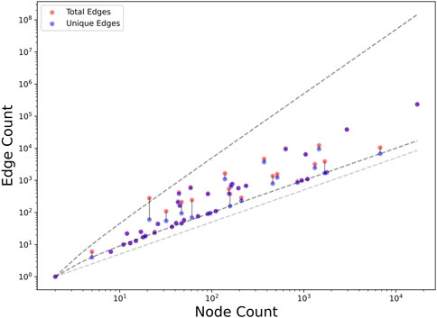 Figure 1. Node, edge, and unique edge count of MicrobiomeKG subgraphs stratified by publication. Each publication is represented by two (potentially overlapping) dots: an orange dot denoting the total number of edges contributed by that publication and a blue dot denoting the number of unique (non-redundant) edges. A gray line connects corresponding dots when they are not next to each other. Dark gray dashed lines denote the theoretical maximum and minimum unique edge counts for a connected graph. These correspond, respectively, to n•(n-1)/2 (for a fully connected graph) and n-1 (for a graph lacking any cliques), where n denotes the number of nodes in the graph. The light gray dashed line denotes the theoretical minimum unique edge count (n/2) without requiring the graph to be connected.