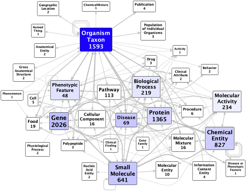 The KG comprises 27,772 nodes (concepts) and 112,118 edges (assertions, of which 71,602 are statistically significant) that outline relationships between the microbiome and various host health factors, spanning 38 Biolink (Unni et al., 2022) ontology classes (most commonly, genes, taxa, proteins, and chemicals—Figure 2; Supplementary Table S2). Disease and SmallMolecule are the most central classes to the graph, followed by OrganismTaxon, PhenotypicFeature, ChemicalEntity, and Gene. Notably, class node count does not correlate to graph centrality. For example, diseases (with 90 nodes) are more central than proteins (with 3,311 nodes), despite a roughly 36-fold ratio in the number of proteins vs. diseases included in the KG (Figure 2). The KG uses eight different biolink ontology predicates, of which the most commonly used are biolink:associated_with and biolink:correlated_with. Taking into account symmetric predicates, there are 244 combinations of subject category, predicate, and object category (Supplementary Table S3), with the most common being “Protein correlated_with SmallMolecule” (22,513 counts).