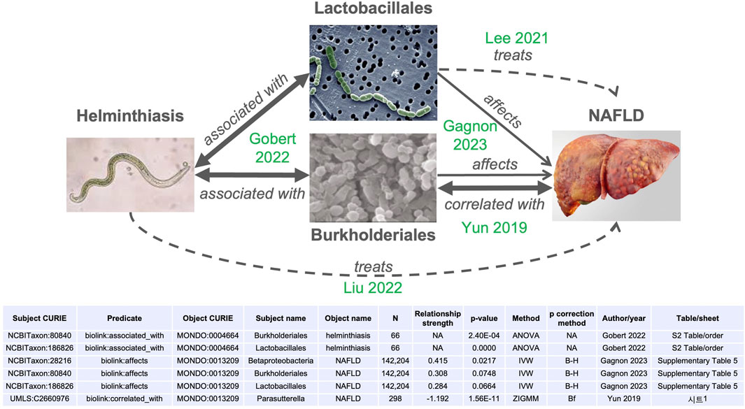 Through the combination of edges derived from publications already integrated into MicrobiomeKG (see table in Figure 3), we identified a hypothetical connection between helminthiasis (MONDO:0004664) and metabolic dysfunction-associated steatotic liver disease (also known as non-alcoholic fatty-liver disease, or NAFLD, MONDO:0013209). This connection is consistent with and supported by published observations (Raj et al., 2020; Lee et al., 2021; Liu et al., 2022).