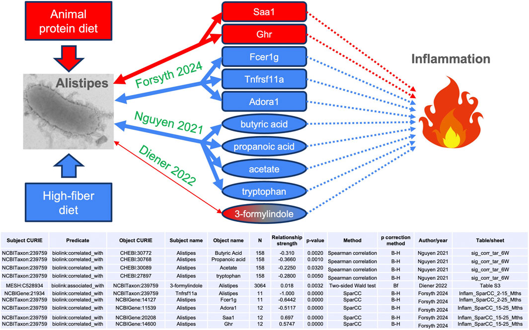 Figure 4. Metabolite and gene connections between the Alistipes genus and inflammation. Arrows indicate relationships between the concepts. Bidirectional arrows represent symmetrical relationships (associated with, correlated with). Dotted lines denote multi-step connections, not detailed here. The source publication for each edge is indicated in green. Red and blue denote, respectively, positive (both increase together) and negative (increase in one with decrease in the other) associations. The thinner line for Diener et al. (2022) represents the weaker effect size, and the color gradient for 3-formylindole denotes the inconsistency in directionality. SparCC: sparse correlation for compositional data. B–H: Benjamini–Hochberg. Bf: Bonferroni.