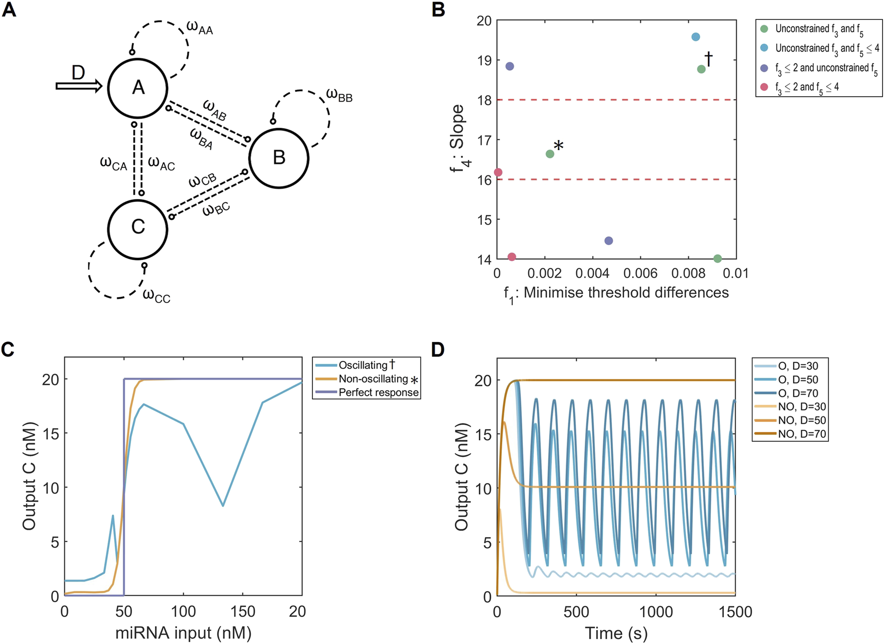 Based solely on the objective values, multiple well-performing systems exist but this is not reflected in the simulated dose-response curves. There, some curves show irregular behaviour, where the output at higher doses of input miRNA is not constant. As an example, from two systems performing similarly in our - search space, one dose-response curve shows irregular behaviour (Figures 2B,C, dagger), while the other does not (Figures 2B,C, asterisk). Their respective responses over time expose that systems with irregular dose-response curves do not reach steady states, but instead, oscillate (Figure 2D). The differences in behaviour are reflected in the topologies of the system (Supplementary Figure S6). Both non-oscillating and oscillating FFL mechanisms involve strong negative regulation on A (either through , or ). Our non-oscillating systems tend to form more regular FFL systems or linear pathways, but oscillating systems form a Goodwin oscillator [positive , positive and negative ; (Goodwin, 1965)]. Therefore, careful design of three-node networks to constrain our algorithm to FFL systems could thus be vital to prevent oscillations.
