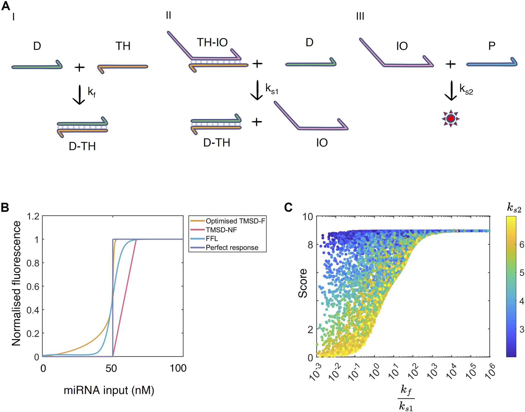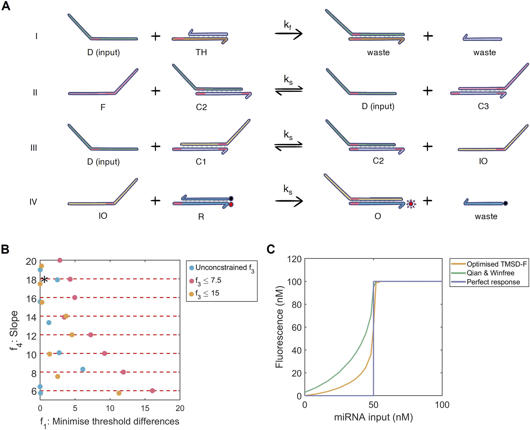 The TMSD system solely relies on nucleotide binding, providing an advantage over the energy-demanding transcription and translation necessary for the functioning of an FFL. The TMSD-F system contains a fuel strand, which catalytically speeds up and increases the production of fluorescent output (Figure 3A II). The same objectives as for the three-node networks, except for , were applied to optimise the reaction rates and improve the dose-response curve produced with the TMSD-F system from (Qian and Winfree, 2011).