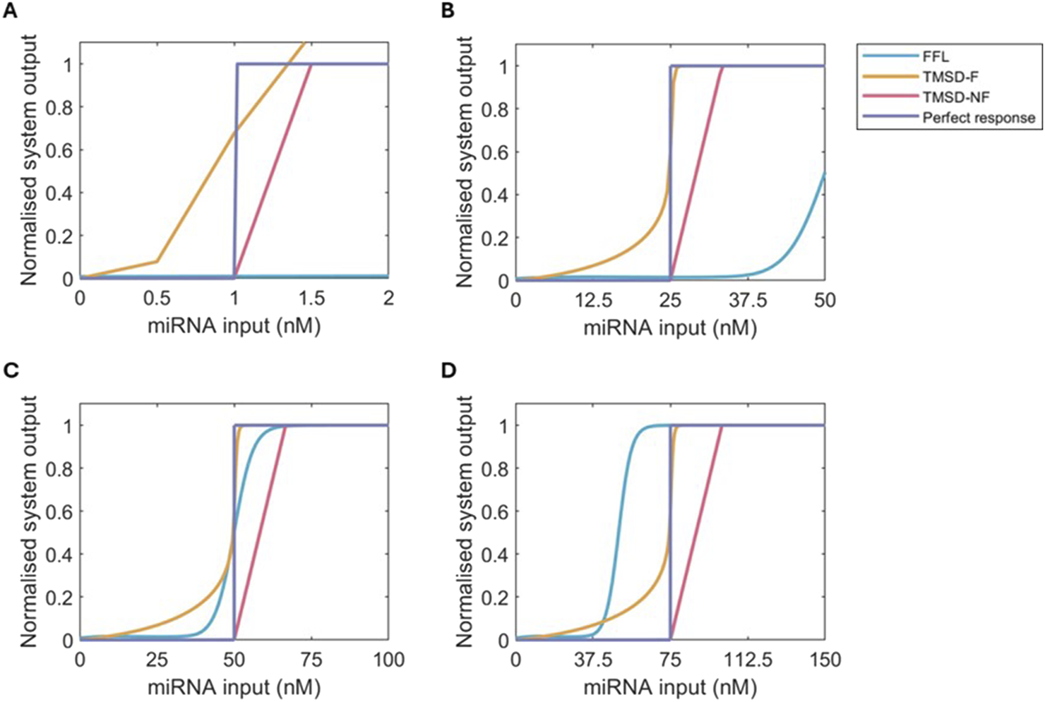 In summary, this study modelled and explored three biological mechanisms in their ability to convert continuous miRNA input into a binary output above a specific threshold. All the system designs studied here showed potential for future use in sensor- or diagnostic tests. However, the RNA-based TMSD systems are easier to engineer, more stable, and more adaptable to new input miRNAs than protein-based networks such as the FFL system. The TMSD-F system would outcompete the TMSD-NF system at higher threshold values if the basal expression produced by our TMSD-F design could be further reduced.