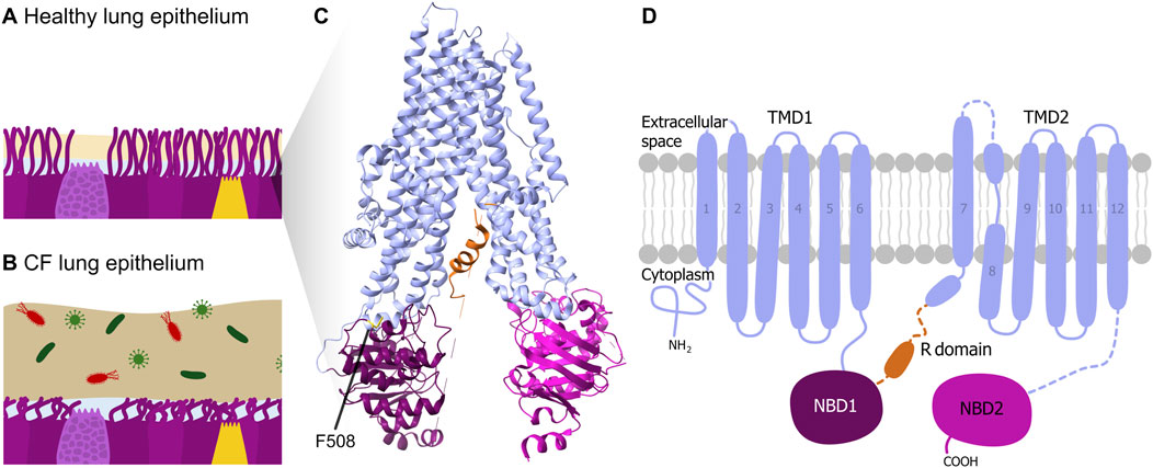 Figure 1. CF pathophysiology and CFTR structure. Schematic illustration of lung epithelial tissue and mucus of (A) a healthy person and of (B) a CF patient. (C) 3D structure and (D) schematic 2D domain structure of the CFTR protein according to (Liu et al., 2017) with the pore-forming transmembrane domains TMD1 and TMD2 (light blue), the nucleotide-binding domains NBD1 (purple) and NBD2 (pink), and the (regulatory) R domain (orange). The phenylalanine amino acid at position 508 (F508) is indicated in the 3D structure.
