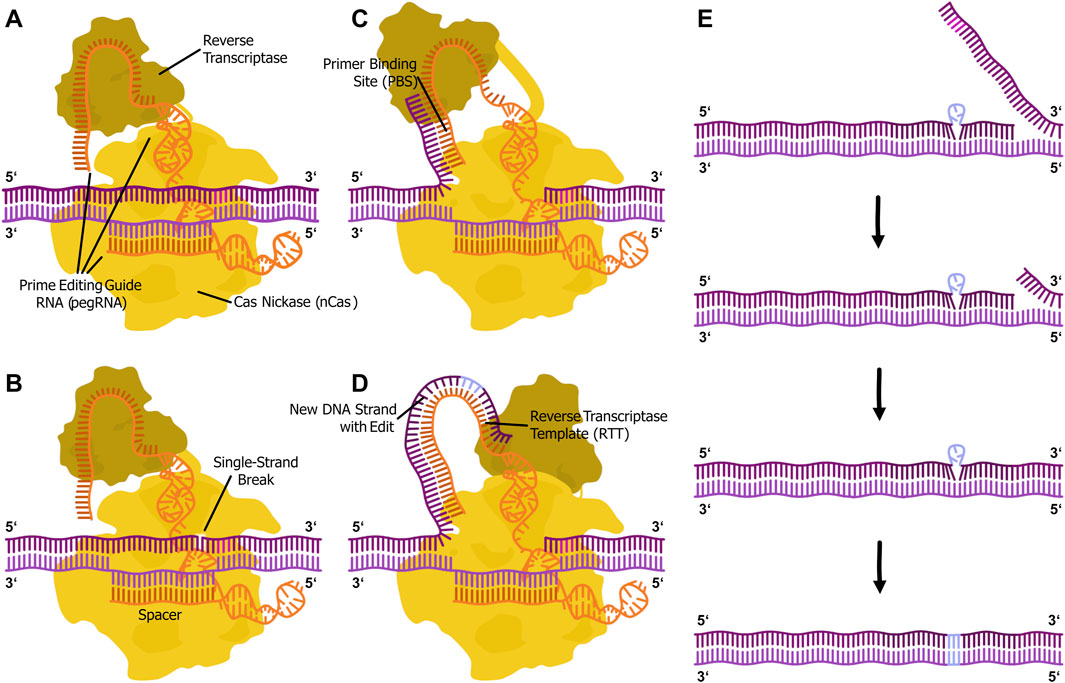 Figure 2. Illustration of the prime editing mechanism. (A) The prime editor fusion protein (PE with Cas nickase domain (yellow) and reverse transcriptase domain (ochre)) complexed with a prime editing guide RNA (pegRNA with spacer, primer binding site and reverse transcriptase template (orange)) locates the genomic DNA (purple) target via DNA-RNA duplex formation and PAM (magenta) recognition by the Cas protein. (B) The nickase introduces a single-strand break in the PAM-containing strand. (C) The primer binding site (PBS) of the pegRNA binds to the 3′-flap of the cut DNA strand. (D) The reverse transcriptase synthesizes the new DNA strand, including the intended edit (light blue), in 5′ to 3′ direction from the primer based on the reverse transcriptase template (RTT) in the pegRNA. (E) The 3′ flap binds back to the genome. This step happens by chance, since both flaps are in an equilibrium. The 5′ overlap is excised by cellular exonucleases. The two flaps are ligated. Cellular mismatch repair integrates the edit into the genome.