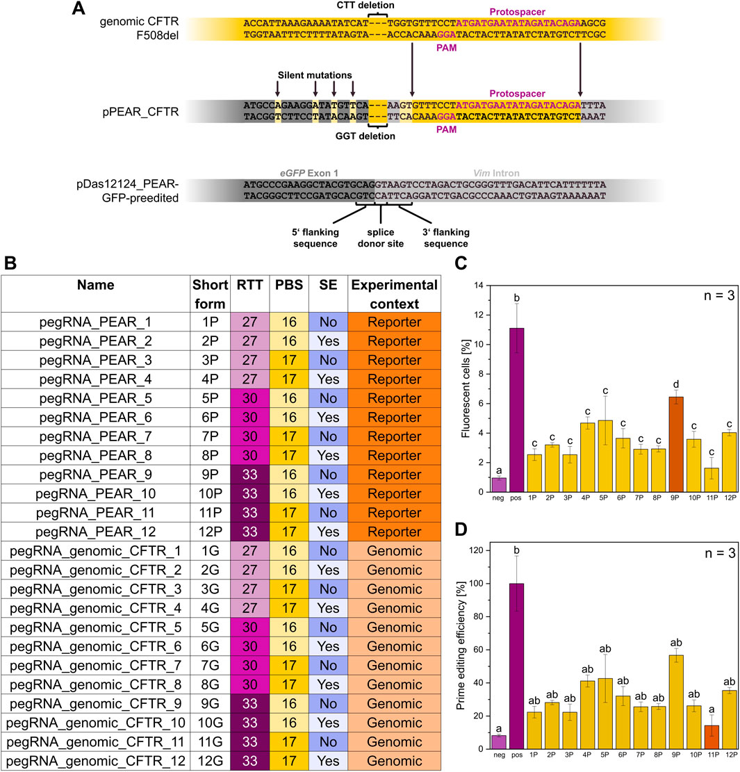 Figure 3. Features of the reporter plasmid pPEAR_CFTR. (A) Excerpts of the sequences of genomic CFTR F508del, the pPEAR_CFTR plasmid constructed and used in this study and the pDas12124_PEAR-GFP-preedited plasmid (Simon et al., 2022), respectively. pPEAR_CFTR differs from pDas12124_PEAR-GFP-preedited in three aspects: A 3 bp deletion at the splice donor site resembling the deletion found in the CFTR F508del sequence, a 27 bp substitution 4 bp downstream of the deletion derived from the genomic CFTR sequence and 4 silent mutations upstream of the deletion increasing the AT content. The upper sequence of each sequence pair represents the coding DNA strand, and the lower sequence represents the template strand. (B) Overview of all pegRNAs with name, short form, Reverse Transcriptase Template (RTT, light purple = 27 bp, purple = 30 bp, dark purple = 33 bp), Primer Binding Site (PBS, light yellow = 16 bp, dark yellow = 17 bp), Silent Edits (SE, dark blue = no, light blue = yes), and experimental context (dark orange = reporter, light orange = genomic). (C) Flow cytometry measurements of CFBE-X cells co-transfected with pPEAR_CFTR, pCMV-PE6c and pegRNA_PEAR variants, n = 3 biological replicates. Comparison of mean values of different pegRNAs varying in their architecture regarding the PBS, RTT, and incorporation or not of silent edits. The negative control (light purple) consists of untreated cells, the positive control (purple) includes cells transfected with a GFP expressing plasmid. Statistics were performed via one-way ANOVA with Tukey’s post hoc test. Within each graph, samples that differ significantly are indicated with a different letter and color (p < 0.05). (D) Prime editing efficiency of pegRNA_PEAR variants with pPEAR_CFTR, the data from (C) were normalized to the positive control, which was set to 100%, n = 3 biological replicates. Statistics were performed via one-way ANOVA with Tukey’s post hoc test. Within each graph, samples that differ significantly are indicated with a different letter and color (p < 0.05).