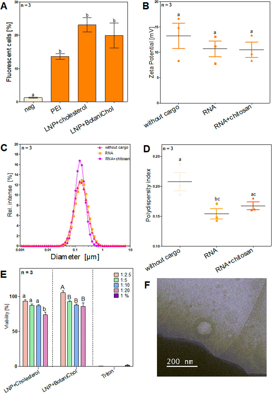 Figure 4. Characterization of LNP formulations and different cargo. Cells were seeded on 24-well plates at a density of 5 × 104 cells/well prior to transfection and were then subjected to transfection at approximately 70% confluence. Cargo included 1,000 ng RNA per formulation. After cultivation cells were analyzed via flow cytometry and LNPs via Zetasizer (A) Comparison of Standard LNP formulation with cholesterol with plant based alternative BotaniChol, n = 3 biological replicates (B) Surface charge of LNPs with different or no cargo n = 3 technical replicates. (C) DLS analysis of LNP size n = 3 technical replicates. (D) Size distribution of LNPs with different or no cargo n = 3 technical replicates. (E) The cell viability (%) over 4 different time points (0 h, 2 h, 4 h, 6 h) for different LNP formulations at different dilutions (1:2.5, 1:5, 1:10, 1:20) and 1% Triton-X. Statistics were performed via two-way ANOVA with Tukey´s post hoc test. Within each graph, samples that differ significantly are indicated with a different letter and color (p < 0.05). Three biological replicates were measured. (F) Cryogenic transmission electron microscopy image of LNPs.