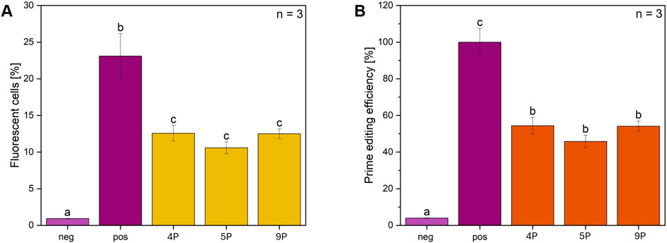 Figure 5. Delivery of prime editing components via LNPs: Flow cytometry analysis of CFBE-X cells with pPEAR-CFTR. (A) The percentage of fluorescent cells in the flow cytometry analysis is shown for three different pegRNAs (pegRNA 4, 5, and 9), which were selected and co-delivered with the pCMV-PE6c plasmid into CFBE-X cells using LNPs. The CFBE-X cells were initially transfected with pPEAR_CFTR, followed by the addition of LNPs loaded with pegRNA-chitosan-complex, n = 3 biological replicates. (B) The percentage of prime editing efficiency is shown for each pegRNA. All samples are shown for each condition compared to control, n = 3 biological replicates. Statistics were performed via one-way ANOVA with Tukey’s post hoc test. Within each graph, samples that differ significantly are indicated with a different letter and color (p < 0.05), “neg” denotes CFBE-X cells without transfection and “pos” cells transfected with a GFP expressing plasmid.