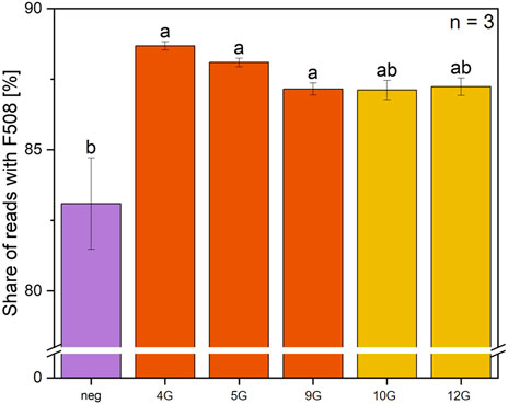 Figure 6. Sequencing analysis of prime editing gene efficiency for F508del correction using five distinct pegRNA variants. The percentage of sequencing reads with correct F508 is shown for prime editing with 5 different pegRNAs. PegRNA_genomic_CFTR_4, 5, 9, 10, and 12 were selected to target F508del and co-delivered with the pCMV-PE6c into the cells, n = 3. Statistics were performed via one-way ANOVA with Tukey’s post hoc test. Within each graph, samples that differ significantly are indicated with a different letter and color (p < 0.05).