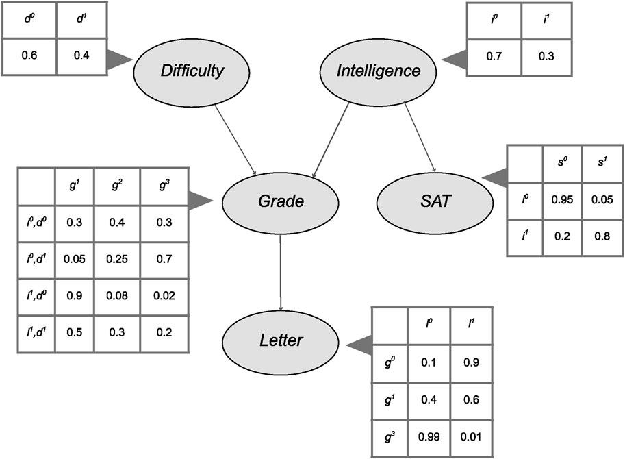 Figure 1 shows a well-known example of BN where the variables course Difficulty and student Intelligence are assumed to be independently assigned prior to the realization (observing the value) of any other variable. The student’s Grade is influenced by both Difficulty and Intelligence. The SAT Score depends solely on Intelligence, while the recommendation Letter is assumed to be based exclusively on the Grade. This structure reflects the intuitive idea that each variable is directly influenced only by its parent nodes in the network (Koller and Friedman, 2009).