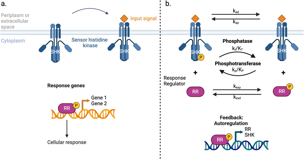 Despite their apparent simplicity, TCSs display a rich spectrum of topologies and dynamic behaviors (Zschiedrich et al., 2016; Groisman, 2016; Stock et al., 2000). In some systems, exemplified by CheA in bacterial chemotaxis, SHK functions exclusively as a kinase, phosphorylating the RR. However, in many TCSs, SHK is bifunctional, participating in both phosphorylation and dephosphorylation of its cognate RR. In such cases, the input signal can modulate either one or both of these enzymatic activities, effectively tuning the rates of kinase and/or phosphatase reactions. TCSs may implement single-step phosphotransfers or multi-step phosphorelays, adding regulatory complexity and potentially delaying signal propagation.