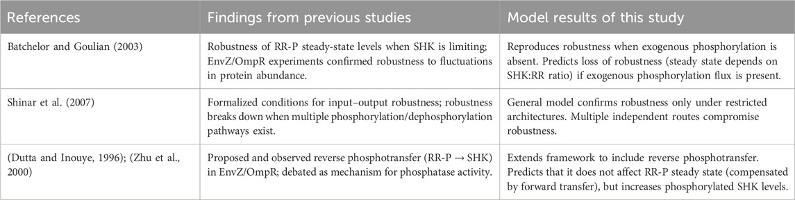 Mathematical modeling has been pivotal in elucidating the emergent properties of TCSs (summarized in Table 1). Batchelor and Goulian (2003) demonstrated that the steady-state level of RR-P can be robust to protein abundance fluctuations when SHK is limiting, a property supported by experimental data. Shinar et al. (2007) formalized the conditions for input-output robustness, showing that robustness is compromised when multiple independent phosphorylation or dephosphorylation routes exist. Igoshin et al. (2008) identified conditions for bistability, particularly when unphosphorylated SHK and RR form “dead-end” complexes or when alternative phosphatases modulate RR-P turnover. Ray and Igoshin (2010), Mitrophanov et al. (2010), and Zorzan et al. (2021) explored the role of transcriptional feedback, showing that autoregulation can alter response speed, overshoot amplitude, and even affect the effective sign of feedback, enabling TCSs to switch between positive and negative regulatory modes depending on signal strength. These studies collectively highlight how bifunctionality, phosphorelays, and feedback loops produce rich dynamic behaviors—including robustness, bistability, and adaptive memory—that are now central themes in systems-level analyses of TCSs.