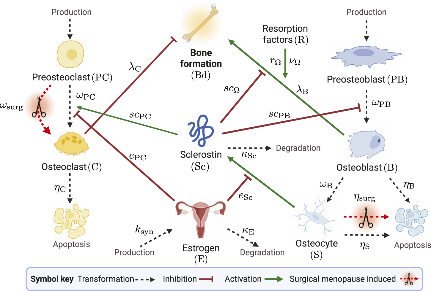 Schematic of mathematical model species in the bone remodeling process. The transformations of cells through differentiation, production, and degradation are illustrated by black dashed arrows. Signaling-related inhibition interactions are shown by red flat-head arrows, and activation interactions are shown as green solid arrows. Parameters that govern interactions are shown near the corresponding arrows. The schematic shows estrogen as an inhibitor of osteoclast differentiation and sclerostin production. Surgical menopause-induced changes are depicted by red dashed arrows with scissors icons. Created with BioRender.com.