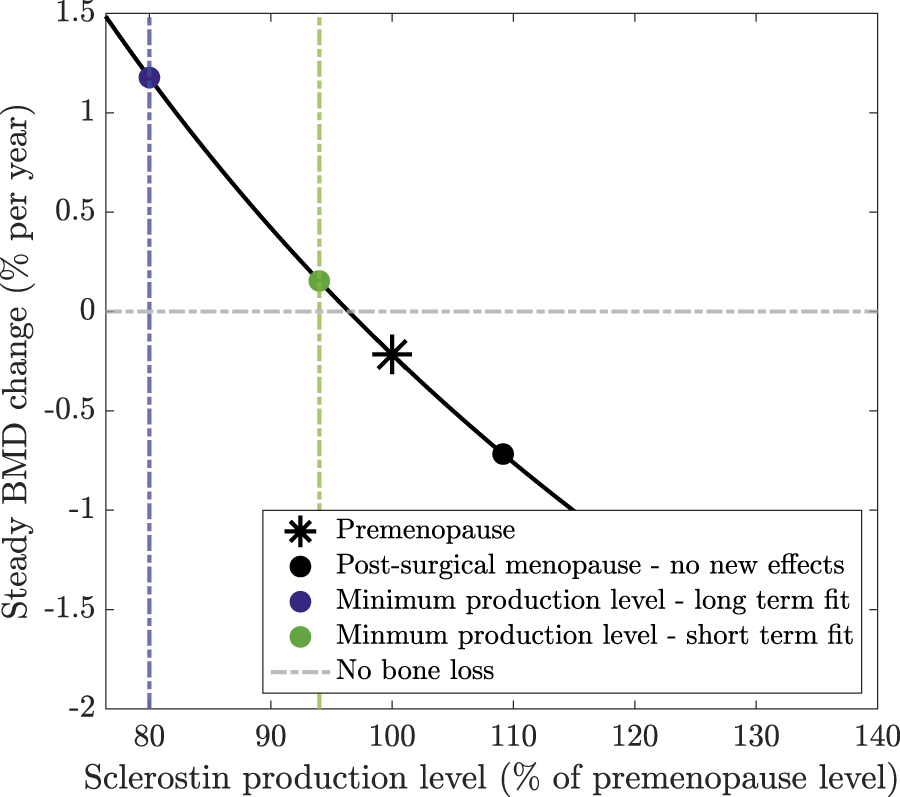 We determine the BMD sensitivity to sclerostin levels presented in Section 3.3 by calculating the steady state levels of cells and chemical concentrations, defined by Equations 4–11. We then calculate the constant rates of BMD loss or production using Equation 12 with the steady-state values of osteocytes, sclerostin, and osteoblasts. Estrogen is assumed to be at a fixed value either at premenopause levels of or at the post-surgical menopause levels of . We calculate the curve of steady BMD change rates in Figure 4 using the model with no new effects, namely, with . We perturb the sclerostin production rate by adding a control parameter multiplying sclerostin production in Equation 11 so that its steady state is defined by . The curve is defined by with . The reference points for the long and short term model fits in Figure 4, are defined by and , respectively, reflecting that the osteocyte levels in each case obtain minimum values of 80% and 94% of the premenopause levels in our results (Figure 3).