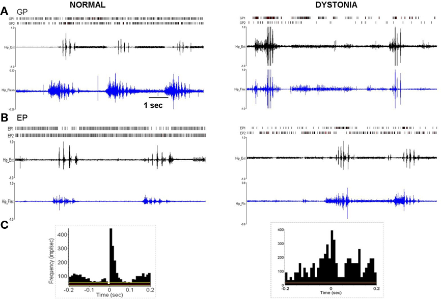 In summary, we have presented novel findings from simultaneously recording from the basal ganglia, along with EMGs from antagonist muscle pairs in unsedated rodents with active dystonia. From our findings, we suggest that in dystonia, dramatic alterations in the underlying discharge activity of basal ganglia neurons, along with a profound loss of independent neuronal signaling, leads to highly pathological signaling during movement. Moreover, we propose that exaggerated and unfocused silencing of GPi neurons during movement results in profound, highly synchronized movement related burst activity in EP which contributes to the hallmark sustained co-contractions and spread to unintended muscles in dystonia. Why surgical approaches to the GPi do not generally improve such abnormalities in secondary dystonias to a similar degree as seen for primary dystonias remains to be determined. Our methodology could serve to lay the groundwork for pursing similar comparison studies in other animal models of dystonia.