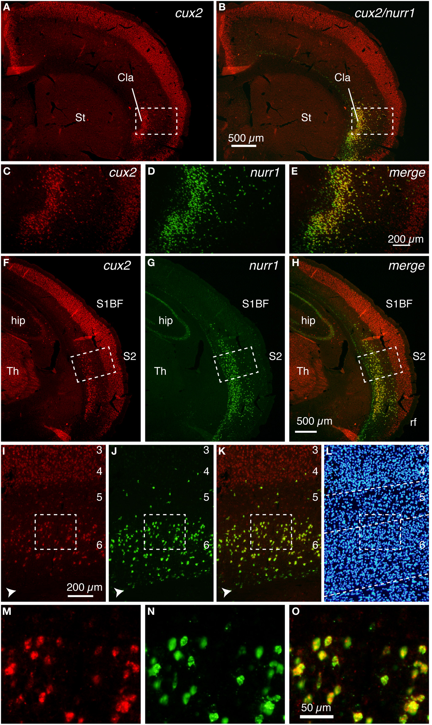 Colocalization of cux2 and nurr1 mRNAs in the claustrum and cortical deep layer of the mouse brain. DIG-labeled cux2 antisense probe (detected in red) and FITC-labeled nurr1 antisense probe (detected in green) were hybridized to the coronal sections of the mouse brain. (A,B) Double ISH of cux2 (red) and nurr1 (green) mRNAs in the frontal section. (A) shows only the red channel (cux2 signal), while (B) shows the merged view for red and green channels of the same section. (C–E) The dashed rectangles in (A,B) were magnified and shown for different channels. (C,D) show the signals for cux2 and nurr1 mRNAs and (E) shows the merged image of (C,D). (F–H) Double ISH of cux2 and nurr1 in the more posterior section. (F,G) show red (cux2 signal) and green (nurr1) channels, while (H) shows the merged view for red and green channels. (I–K) Dashed rectangles in (F–K) were magnified. The arrowheads in panels (I–K) indicate the nurr1+/cux2− cells in layer 6b. (L) Hoechst nuclear staining to confirm lamina boundaries in (I–K). The dashed lines indicate the lamina borders determined by the density of nuclear staining. (M–O) Dashed rectangles in (I–K) were magnified. Note exact colocalization of the two mRNAs in (O). Cla, claustrum; hip, hippocampus; rf, rhinal fissure; S1BF, somatosensory barrel field; S2, secondary somatosensory area; St, striatum; Th, thalamus.