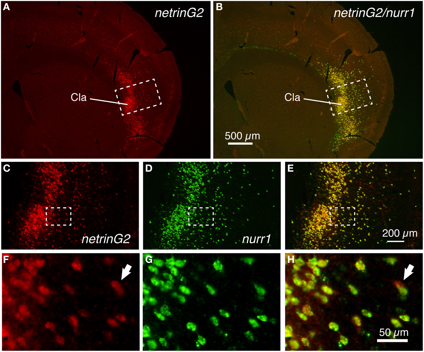 In a previous study, the netrinG2 gene was reported to be expressed in the claustrum and layer 6 neurons of the insular cortex (Miyashita et al., 2005). As shown in Figures 4A–H, we found by double ISH that the netrinG2 gene is co-expressed with the nurr1 gene in layer 6 of the insular cortex as well as in the claustrum. Like cux2 gene, we observed nurr1mRNA-positive cells in layer 6b that do not express netrinG2 mRNA. The expression of netrinG2 and nurr1 mRNAs in the insular cortex, however, generally coincided in limited subpopulation. The coexpression of netrinG2 and nurr1 genes were observed in all the areas we examined including, frontal, motor, somatosensory, temporal, and visual areas (data not shown).
