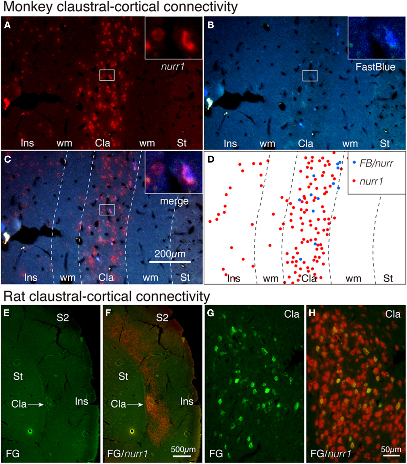 Tracer-ISH of monkey and rat claustrum. (A–D) FastBlue was injected into areas V4 and 7a and several claustral cells were retrogradely labeled (B,D). The same section processed for nurr1 ISH (A,C) exhibited nurr1 expression in all the FastBlue-labeled cells (see the insets). The rectangles within the claustrum are shown magnified in the insets for each panel. (D) indicate the schematic plot for (C); the nurr1 single-positive cells were plotted in red, and the nurr1/FastBlue double positive cells were plotted in blue. (E,F) FluoroGold was injected into V1 and the claustral cells were retrogradely labeled. The same section was processed for nurr1 ISH. (G,H) The claustral regions of (A,B) were magnified. Cla, claustrum; Ins, insular cortex; S2, secondary somatosensory area; ST, striatum; wm, white matter.