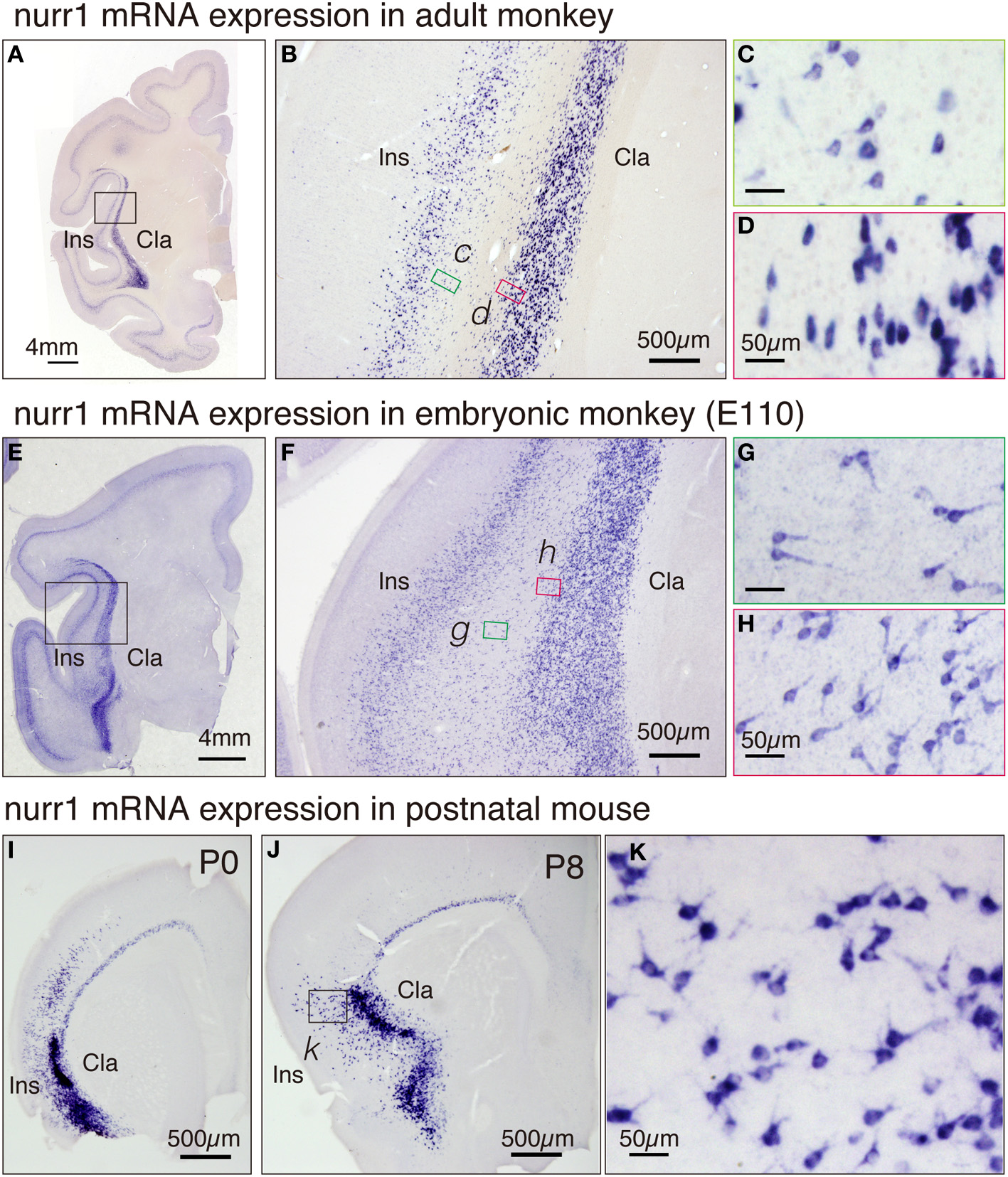 Expression of nurr1 mRNA in the embryonic monkey and postnatal mice. (A) Single ISH of nurr1 mRNA in the coronal section of the adult monkey brain hemisphere. Note a dense expression of nurr1 mRNA in the claustrum and layer 6 of the insular cortex. (B) The rectangle in (A) was magnified. Note the scattered cell population in the white matter between the insular cortex and the claustrum. (C,D) The rectangles in (B) were magnified. (C) shows the shapes of the cell bodies at the bottom of the insular cortex, most of which were typical pyramidal except those at the very bottom (right side of the panel). (D) shows the shapes of the cell bodies at the top of the claustrum, which are elongated in horizontal direction. (E) ISH of nurr1 mRNA in the coronal section of the embryonic E110 monkey brain hemisphere. (F) The rectangle in (E) was magnified. Note the abundant scattered cell population in the white matter between the insular cortex and the claustrum. (G,H) The rectangles in (F) were magnified. (G) shows the shapes of the cell bodies in the white matter, many of which appear like inverted pyramidal cells. (H) shows the cell bodies at the top of the claustram, which are irregularly shaped. (I,J) ISH of nurr1 mRNA in the coronal section of the postnatal P0 and P8 mouse brain hemisphere. (K) The rectangle in (J) was magnified. Note similarity of the shapes of the cells to those in the monkey claustrum (G).
