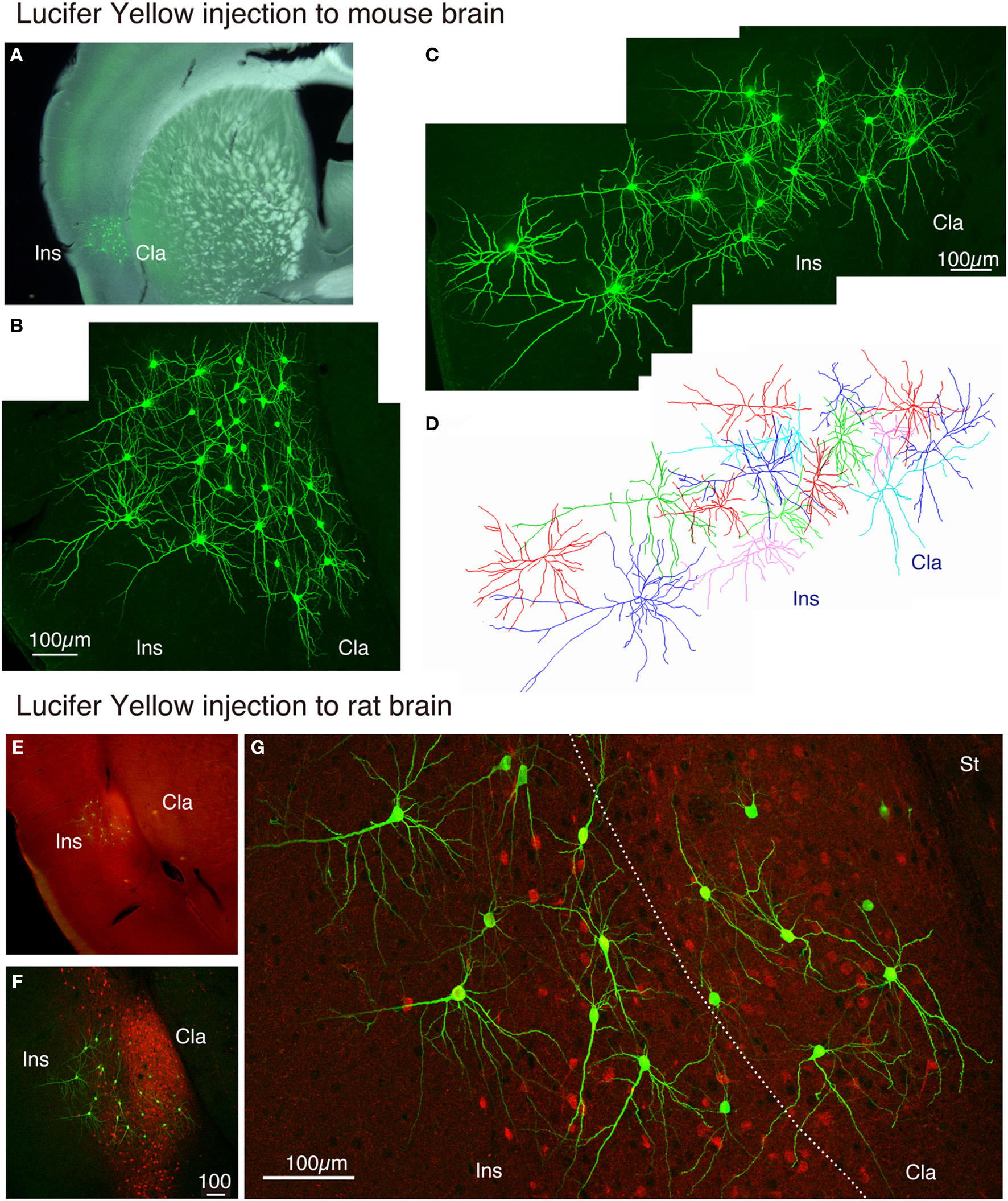 To investigate dendritic morphology, Lucifer Yellow injection was performed essentially as described previously (Oga et al., 2013). Briefly, 11-week old male BL6 mice (~ 30 g) or 7-week old male Wistar rats (~ 150 g) were perfused with 30 and 150 ml of 4% paraformaldehyde/0.1 M phosphate buffer, at the rate of 1 or 10 ml/min for mice and rats, respectively. The fixed brain was excised and sliced at 200 μ m, in the coronal plane, using a vibratome. After counterstaining with 1 μ g/ml DAPI, Lucifer Yellow was injected into individual cells under the visual guidance of ultraviolet illumination. In the low-power view of the dark field image, the insular/claustral regions appeared as a dark column next to the rhinal fissure, which itself was sandwiched between the brighter neocortex and piriform cortices. The injections were targeted from the posterior side of the slices.