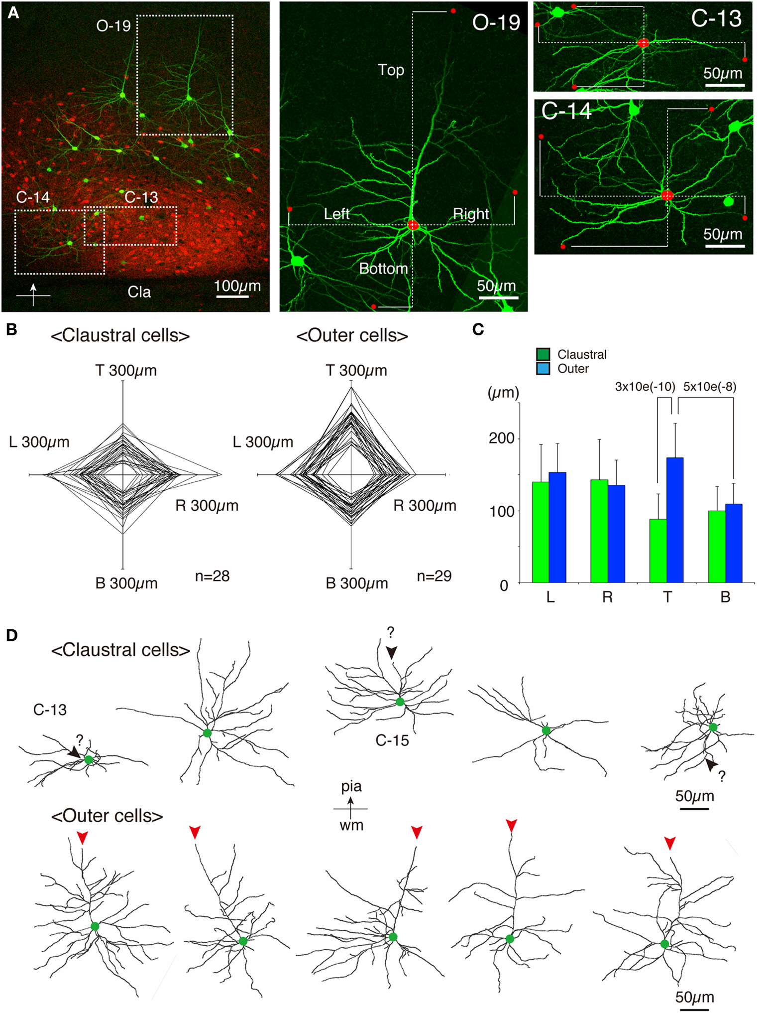 Quantitative analysis of dendritic field extension for Lucifer-Yellow injected cells. (A) A typical example of the fluorescent image of the analyzed insular/claustral region. The axis of analysis (shown by the bar and the arrow at the bottom) was determined so that the pia is to the “Top.” This panel was taken from the same section shown in Figures 7E–G. Three analyzed cells, C-13, C-14, and O-19, were magnified on the right. The red dots on each cell indicate the tips of the dendrites that determined the “Top,” “Bottom,” “Right,” and “Left” borders of the dendritic field of the cell of interest. The distance from the center of the cell body to these borders were measured (dotted lines) to examine the polarity of dendritic extensions. Because we wanted to measure the overlaps between the insular and claustral territory, we measured the distance in these max projection images, and not the 3D distance from the tips to the cell body. (B) Rader plots for 28 claustral and 29 outer cells chosen from eight slices of two rats were superimposed. The ends of each axis correspond to 300 μ m from the center. The “claustral” cells were determined based on the counterstaining by latexin or parvalubumin. The “outer” cells were those that were located outside the dense latexin-positive regions but within the regions containing scattered latexin+ cells. (C) The averages and standard deviations for Left (L), Right (R), Top (T), and Bottom (B) values for claustral and outer cells are shown. The difference of the “Top” values between the claustral and outer cells or the difference of the “Top” and “Bottom” values for the outer cells were statistically significant with the indicated p-value. (D) Five representative examples each of the dendritic reconstruction for the claustral and outer cells by Imaris FilamentTracer. All these neurons are oriented so that the top is to the pia. Green dots indicate the position of the cell bodies. The red arrowheads of the outer cells indicate the apical dendrites that were clearly different from other basal dendrites by morphology. Most of the claustral cells lacked such apical dendrites. However, candidates for apical dendrites which may be oriented toward the anterior or posterior directions (orthogonal to the slice plane) were present in some cells, which were shown by black arrowheads with question marks.