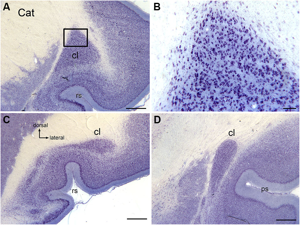 The claustrum in the cat shown on cresyl violet-stained celloidin-embedded sections. (A) The claustrum at about its rostro-caudal center. The rectangle shows the location of the image in (B). (B) Cells in the claustrum. (C) The claustrum at its rostral limit. (D) The claustrum at its caudal limit. Scale bars: A, C, D = 1 mm; B = 100 μm . Abbreviations: cl, claustrum; ps, pseudosylvian sulcus; rs, rhinal sulcus.