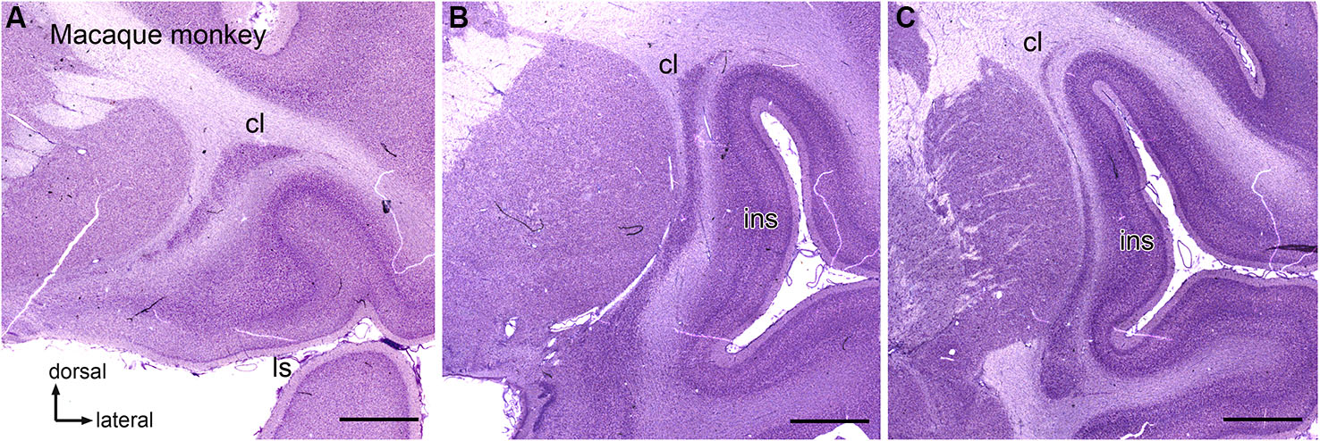 The claustrum in the macaque monkey. (A) Rostral claustrum. (B) The claustrum at about its rostro-caudal center. (C) The caudal claustrum. Note the long, thin vertical stem and the ventral enlargement in (B), (C). Scale bars: A, B, C = 2 mm. Abbreviations: cl, claustrum; ls, lateral sulcus; ins, insula.
