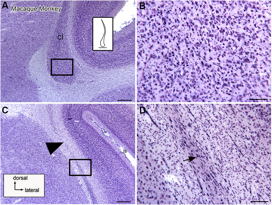 Neuronal organization of the claustrum in the macaque monkey shown on higher magnification images. (A) The ventral expansion of the claustrum in the macaque monkey. The rectangle shows the location of the image in (B). The inset shows an outline drawing of the entire claustrum. (B) Neurons in the ventral enlargement of the monkey have round or polygonal somata. (C) Cells in the long ascending stem of the claustrum. The arrowhead indicates a cell-sparse region. The rectangle shows the location of the image in (D). (D) Many neurons in the thin ascending stem have somata that are elongated parallel to the borders of the structure (arrow). Scale bars: A, C = 500 μm; A, inset = 2 mm; B, D = 100 μm.