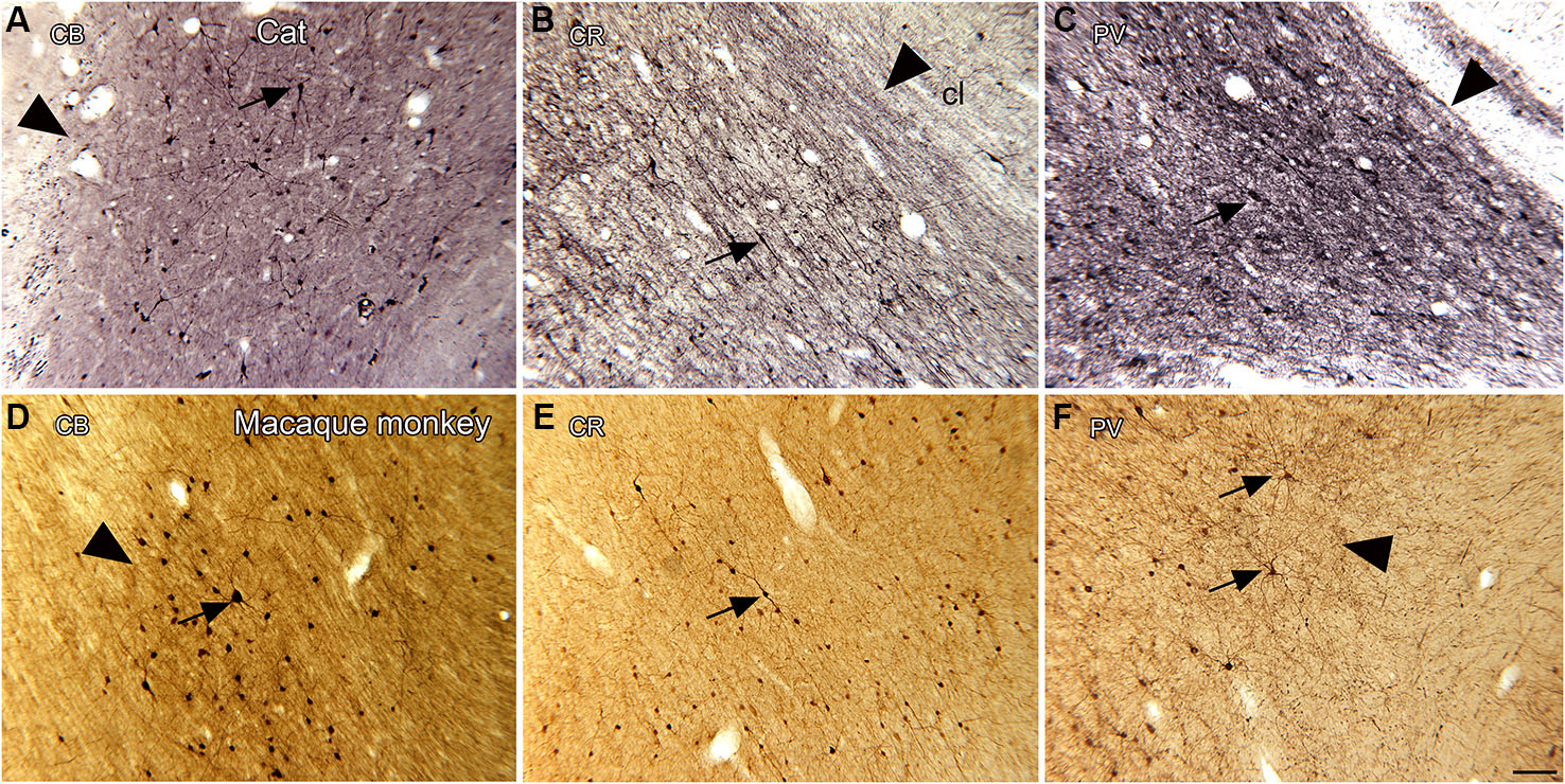 Spacing and density of neurons in the claustrum of the cat (A, B, C) and macaque monkey (D, E, F) claustrum that are immunoreactive for the calcium-binding proteins. (A) CB, cat. The arrowhead indicates the medial border of the claustrum; the arrow indicates a labeled cell. (B) CR, cat. The arrowhead shows the border of the claustrum and the arrow a cell with a fusiform soma. (C) PV, cat. The claustrum is darkly stained; the border (arrowhead) is very clear. The arrow shows a PV-ir neuron. A, B, C glucose oxidase modification of DAB for visualization of immunoreactivity. (D) CB, monkey. The arrowhead shows the border of the claustrum, the arrow a labeled neuron. (E) CR, monkey. The arrow shows a neuron with an elongated soma. (F) PV, monkey. The arrowhead shows the edge of the claustrum. The arrows show two large neurons and their dendrites. D, E, F, standard DAB visualization of immunoreactivity. Scale bar: F = 100 μm; same magnification for all other panels. Abbreviations: CB, calbindin; CR, calretinin; PV, parvalbumin.