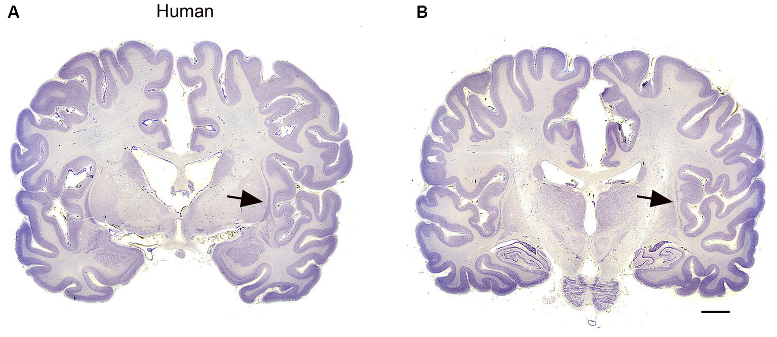 Species differences in cortical organization are mirrored in differences in the size and shape of the claustrum. Buchanan and Johnson (2011) illustrate the shape and size of both cortex and claustrum in 26 different species. Kowiański et al. (1999) illustrated the shape of the claustrum in different species. They recognized five different morphological types; the shape of the dorsal claustrum in 8 different species is illustrated in Figure 5 (modified from Kowiański et al., 1999). It is important to note, however, that while all of these drawings show the claustrum as a continuous structure, examination of Nissl sections from the macaque monkey at higher magnification (as in Figure 3C) shows discontinuities. Figures 6A,B supplement the drawings of the human claustrum with photomicrographs of the human claustrum (at arrows) in Nissl-stained coronal sections of the human brain. The image in A shows a hint of a ventral enlargement as seen in macaque monkey; the image in B supports dorsal-ventral symmetry. A ventral enlargement is present in small-brain lissencephalic New World anthropoid primates such as owl monkeys, squirrel monkeys, titi monkeys, tamarins and marmosets, although it is not as pronounced in the strepsirrhine primates, the lemurs and lorises. However, while illustrations can show species variability in the form of the claustrum, they cannot relate the differences in the shape and size of the claustrum to differences in the numbers or organization or specializations of cortical areas.