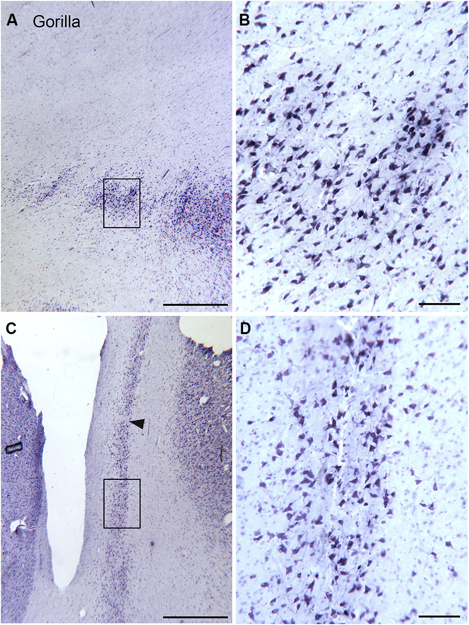 Size shape and density of neurons in the claustrum of the gorilla at different rostro-caudal and dorso-ventral levels. (A) Cell islands in the dorsal claustrum (section outlined on Figure 7A). The rectangle shows the location of the image in (B). (B) Stained somata in the claustrum; many somata are multipolar. Scale bar = 100 μm. (C) Image of the more ventral and caudal claustrum; the section was outlined in Figure 7E. The rectangle shows the location of the image in (D). The arrowhead indicates a cell-sparse region. (D) Somata in the ventral and caudal claustrum; many are multipolar. Scale bars: A, C = 1 mm; B, D = 100 μm.