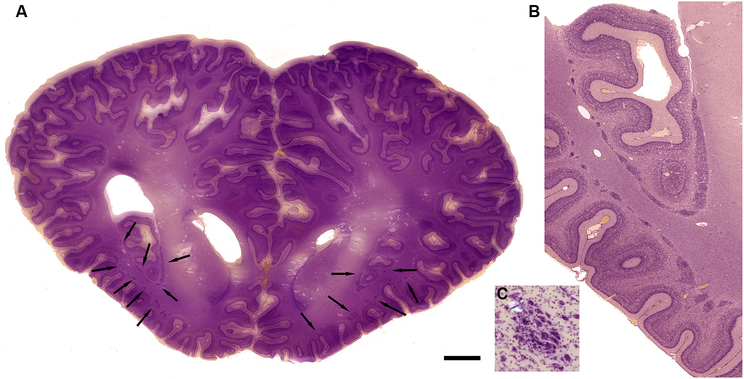 Morphology of the claustrum in the humpback whale (Megaptera novaeangliae). (A) Parasagittal section through one hemisphere of an adult humpback whale. There are a very large number of claustral islands dispersed in the white matter underlying the perisylvian, ectosylvian, and suparsylvian cortex, as well as in the frontal pole (arrows). (B) Higher magnification image of a large cluster of these claustral neurons in the white matter of the suprasylvian gyrus. (C) Shows cellular details. Note that as in the bottlenose dolphin, these claustral island are completely separate from the neocortex. Scale bars = 2 cm (A), 6 mm (B), and 1.5 mm (C).