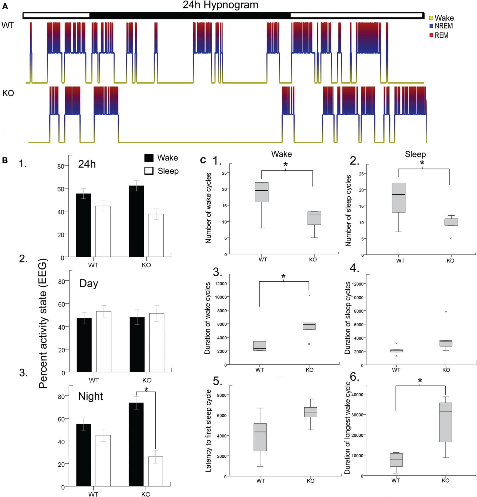 Blinded video-EEG/EMG manual scoring quantitated activity cycles to generate (A). Hypnograms for each mouse in the study and showed significant sleep structure anomalies in the KO mice (B). Histograms quantitating sleep/wake cycles for the data set (WT and KO n = 6 each) showed (B1). No significant differences in percent time spent awake or sleeping were found when light/dark cycles (i.e., 24 h) were pooled together (lights on 7 am off 7 pm). However, when the data was split by light/dark cycle (B2,B3). KO mice showed significant sleep deprivation compared to WT mice. The dark cycle longer wake periods were not associated with any significant increase in behavioral quantitation for hyperactivity scores. (C) Wake and sleep cycle quantitation revealed an altered number and duration of cycles with significantly long wake cycles in KO mice. (C1,C2) Show significantly lower counts of both wake and sleep cycles in KO mice. (C3,C4) showed that the wake cycles in KO mice were significantly longer in duration and while the sleep cycles showed a trend to be longer than in WT mice. (C5) The latency to first sleep cycle was significantly longer in the KO mice compared to the WTs. (C6) The duration of the longest wake cycle within each 24 h recording were significantly longer in KO mice than in WT mice. *p < 0.05.