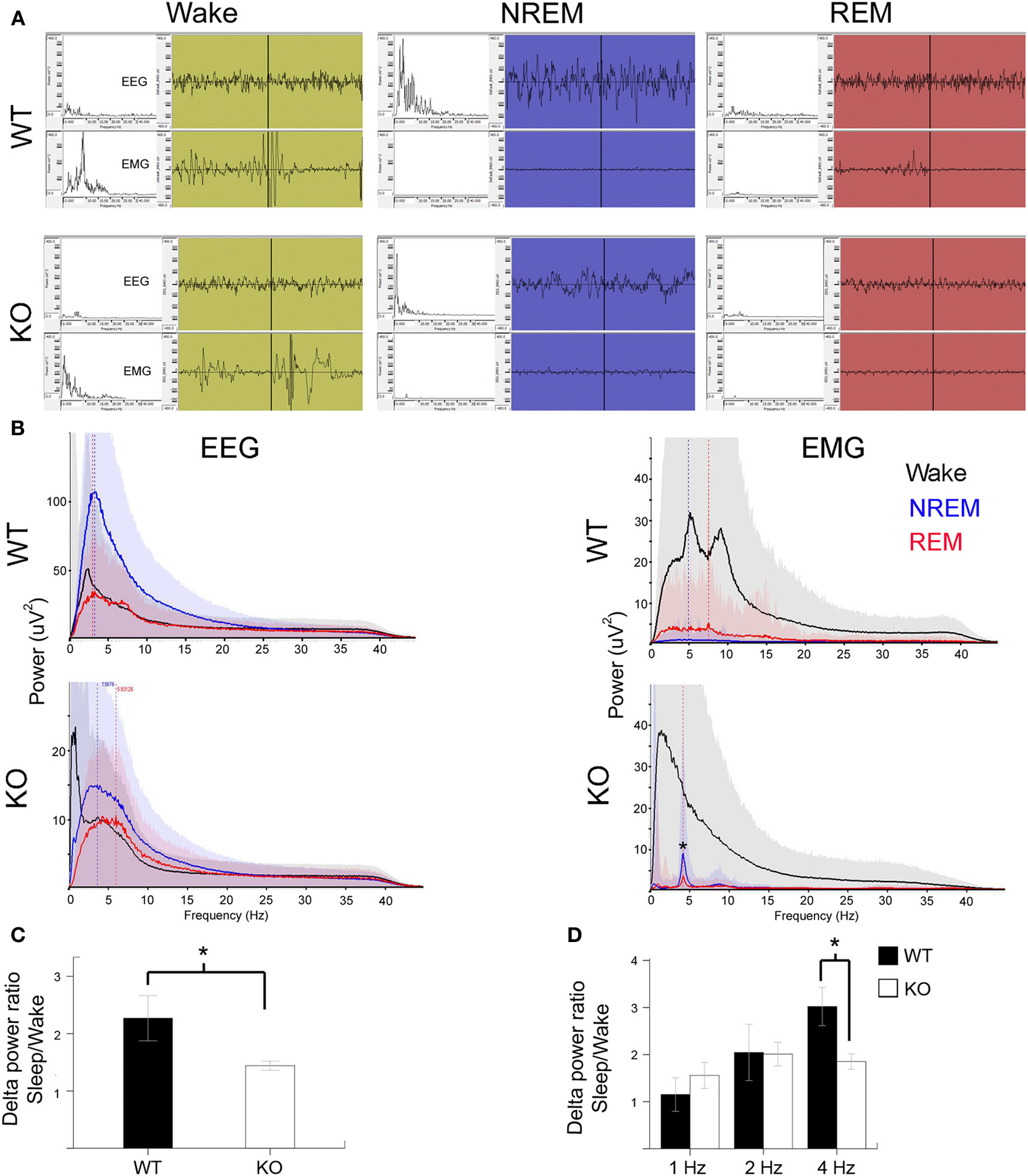 Poor SWA sleep during NREM indicates severe sleep dysfunction in KO mice. (A) Representative 10 s EEG traces (top panel) were scored as wake (green), NREM (blue), and REM (red) along with the synchronous EMG (bottom panel) recorded from WT and KO mice. Insets on left are spectrograms for the EEG and EMG for those 10 s in the 0.5–40 Hz range (left to right). EEG spectrogram showed that KO mice had poor power in the delta range (0.5–4 Hz) that is typical of SWA sleep during NREM compared to WT mice. Note WT REM shows a typical muscle twitch artifact on EMG. (B) Power analyses for the same mice represented in EEG traces for the 24 h scoring showed a severe overall deficit in NREM power in delta range in KO mice. EMG power showed accurate patterns of associations for the EEG scoring in that the most power was observed during wake states followed by REM when isolated brief muscle twitches were recorded. Note the artifact peak (*) in KO EMG during REM and NREM sleep was due to the leads picking up EKG signals when the mouse was sleeping in a hunched position. (C) Group data for quantification of delta power during NREM for each mouse normalized over delta power during their individual wake cycles showed significant difference between WT and KO mice in SWA strength. (D) This significance was driven by delta activity in the 4 Hz range.