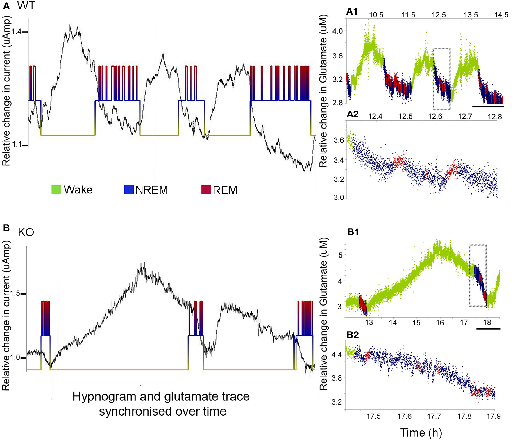 Sleep cycle dysfunction and glutamate loads. (A,B) show the synchronous and relative glutamate change associated with the EEG/EMG and video scored hypnograms for representative WT and KO mice respectively [raw glutamate in-vivo recording (black) overriding hypnograms (green = wake, blue = NREM, and red = REM) for each mouse]. Both groups showed an activity dependent increase in glutamate during the wake cycle and a decrease during the sleep scored EEG. (A1,B1) Color-coding of the rate of glutamate revealed significant differences in the dynamics of the rates of change between KO and WT mice. Scale bar = 1 h. (A2,B2) Expanded times scales of sleep microstructure [of time slots marked by dotted rectangles in (A1,B1)] show the slow decline in glutamate levels as sleep progresses and also the small peaks of glutamate that are tightly correlated with REM cycles (paradoxical sleep) not clear in the KO.