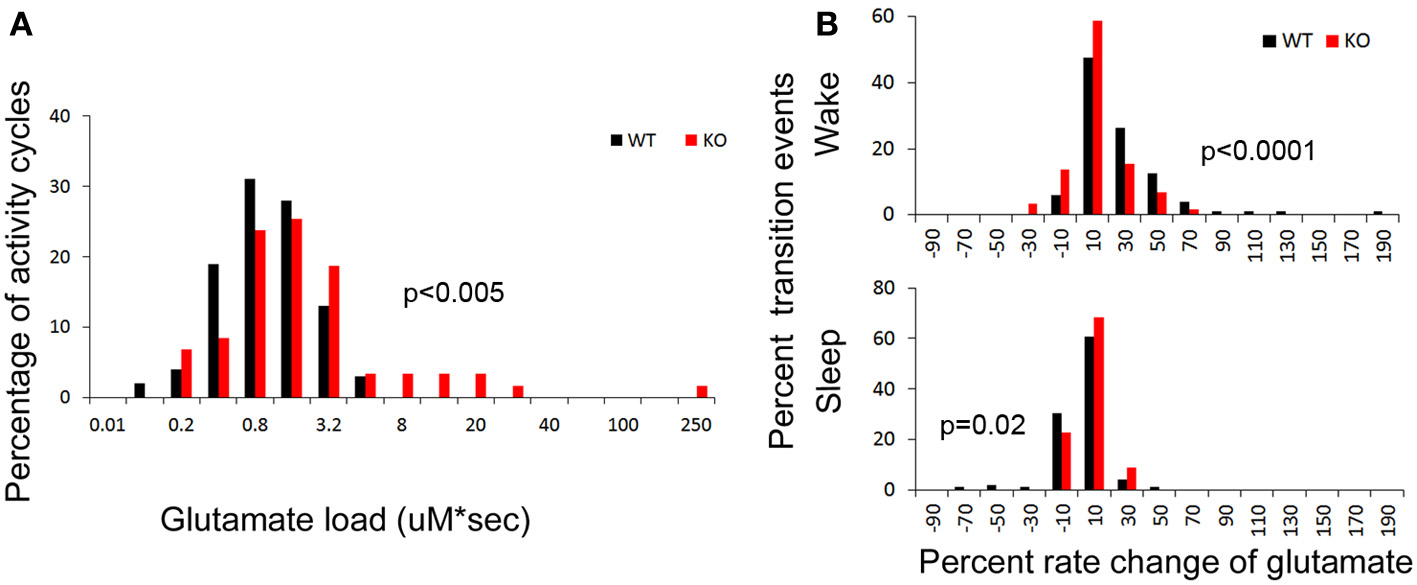 (A) Group data for glutamate loads calculated per wake cycle in drift corrected traces of glutamate in-vivo recordings (see Methods). Frequency histogram represents glutamate loads per wake (activity) cycle for every mouse in study and show significantly higher number of activity cycles with larger glutamate loads in KO mice compared to WT (red distribution curve shifts to the right, p < 0.03). (B) Frequency histograms of the percent rates of change of glutamate over time for every transition to wake and sleep states. Both these transitional dynamics were significantly altered in KO mice. The KO mice showed a slower rate of rise (red shift to left) and faster rate of fall (red shift to right) of glutamate that was associated with transitioning to wake and sleep respectively, compared to WT mice (black).