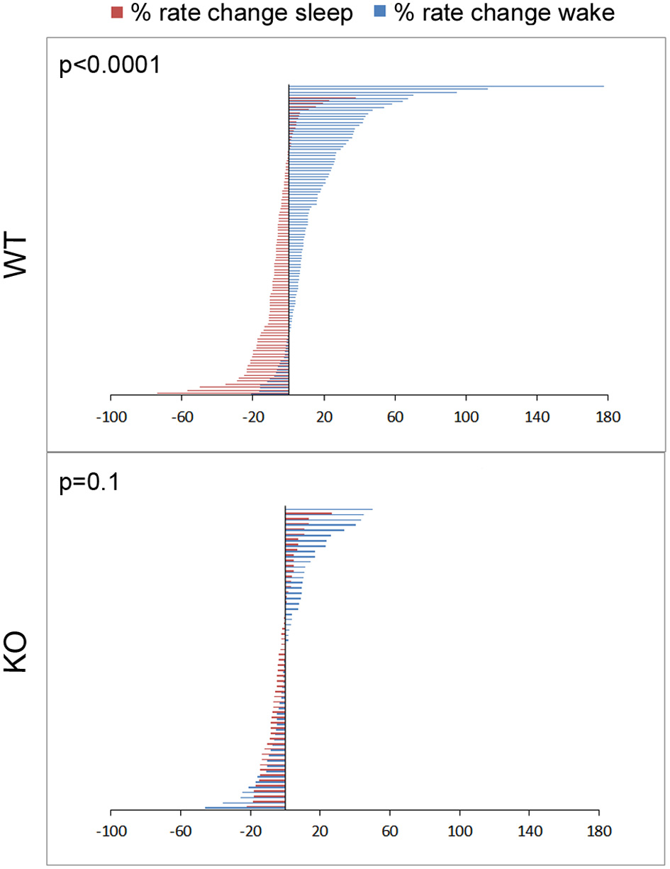Physiology of sleep and wake state related glutamate dynamics in WT vs. KO mice. Percent rate of change of glutamate concentrations in extracellular space following transitions from sleep-wake to wake-sleep states on EEG, happen within minutes. Percent rate of change of glutamate over the first 5 min of transitioning to a sleep or wake state for all sleep-wake cycles in the study (n = 103 and 58 WT and KO respectively) were defined by 2 significantly different and opposite glutamate dynamics with very little overlap between the 2 transitions phases in WT mice. This difference was obliterated in KO mice due to dysfunction of the activity dependent glutamate homeostasis that distinguished the dynamics between the 2 transition phases and genotypes at 7 weeks old.