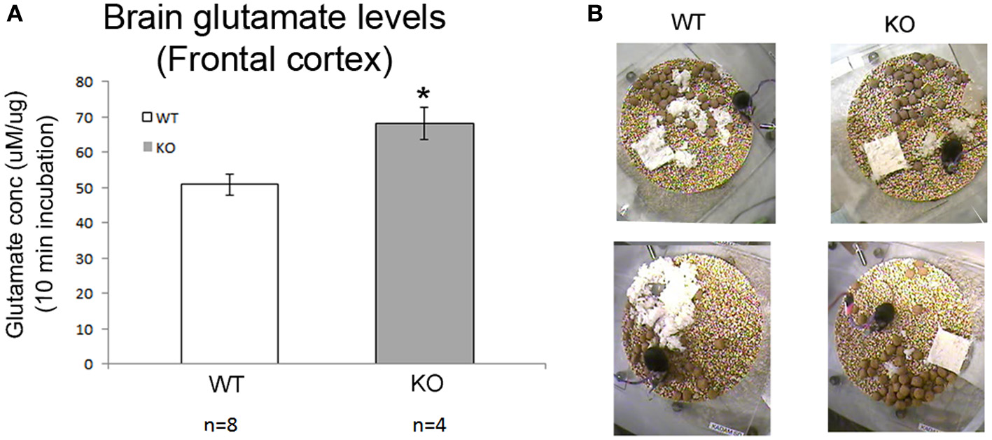 Absolute brain glutamates levels and sleep deprivation a vicious cycle. (A) Brain glutamate levels in frontal cortex were significantly higher in KO mice compared to WT. (B) Show poor nesting behavior scoring as detected in our 24 h video recordings where nesting pads were left untouched overnight (*p < 0.05).