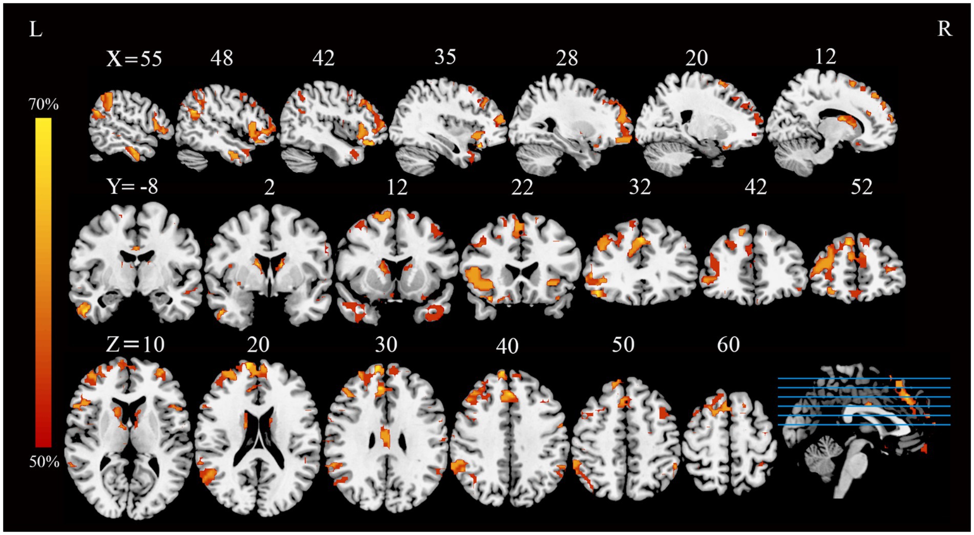 MRI brain scan images showing three views: sagittal, coronal, and axial slices, each labeled with coordinates. Orange and red highlighted areas represent regions of interest, indicating varying activity levels. A color bar on the left shows percentages from fifty to seventy percent, with yellow indicating higher activity and red indicating lower.