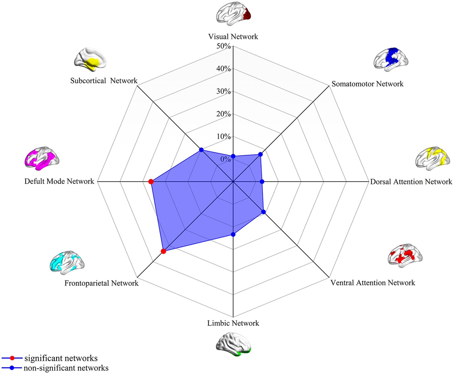 Radar chart visualizing brain networks with labeled regions: Visual, Somatomotor, Dorsal Attention, Ventral Attention, Limbic, Frontoparietal, Default Mode, and Subcortical. Significant networks are marked in red, and non-significant networks are shaded in blue. Illustrations of brain networks encircle the chart.