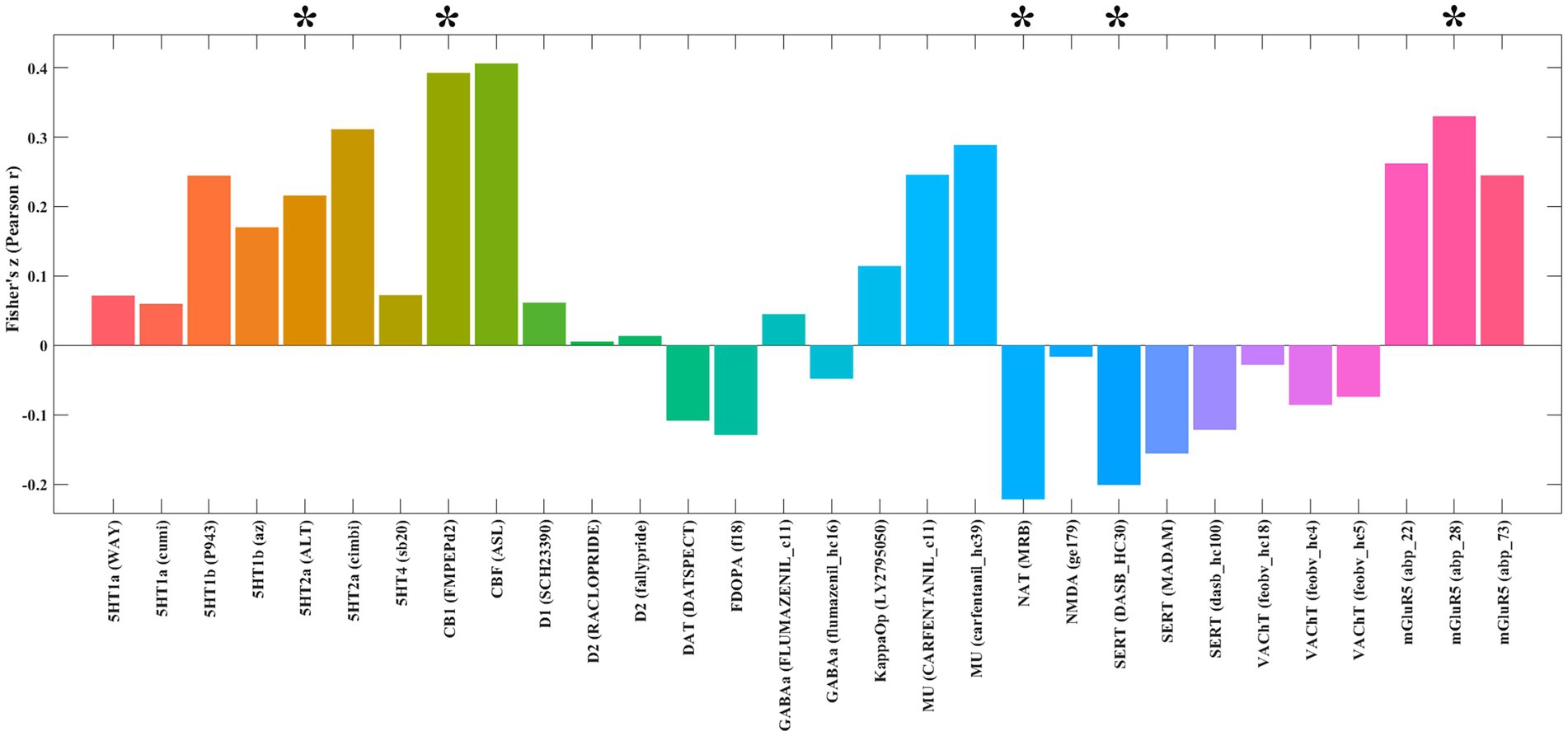 Bar graph displaying Fisher's Z values for various receptors and transporters. Positive bars are colored in different shades of orange, green, and pink, while negative bars are in shades of blue and purple. Labels include 5HT1a, CB1, DAT, MU, SERT, and mGluR5. Asterisks denote significance above certain bars.