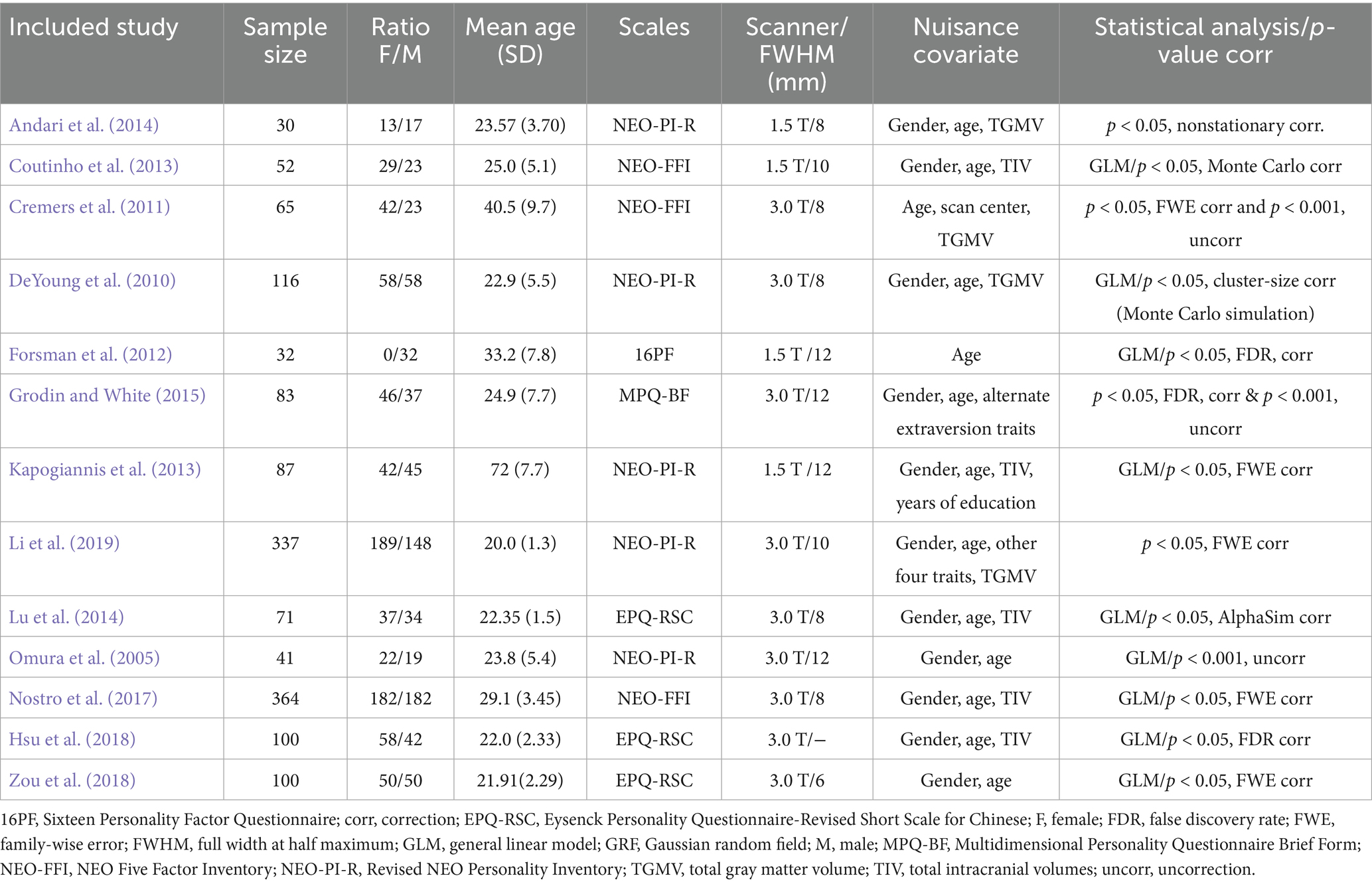 Table 1. Sample and imaging characteristics of the studies included extraversion analysis.