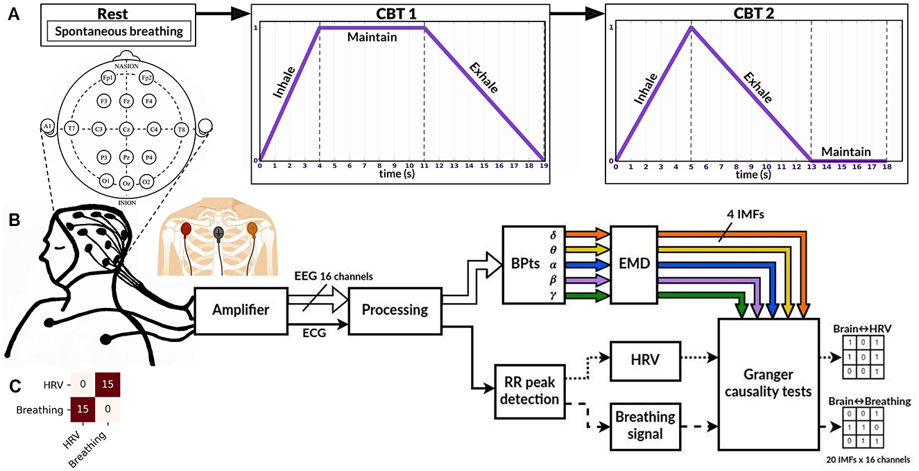 Figure 1. Experimental paradigm and processing pipeline. (A) Overview of the experimental paradigm, which includes three stages (conditions): Rest, CBT 1 (controlled breathing task 1), and CBT 2. (B) Experimental setup and signal processing pipeline for each condition. Sixteen EEG channels were recorded to compute band power time series (BPtsx), which were then decomposed using empirical mode decomposition (EMD) into four intrinsic mode functions (IMFs) per band and per channel. R-peaks were detected from the ECG signal and used to interpolate the HRV and breathing signals. Granger causality tests were performed on the resulting signals (see Methods for details). (C) Results of the Granger causality tests between the HRV and breathing signals for each condition. Across all 15 subjects, HRV G-caused breathing (first row, second column) and vice versa (second row, first column).