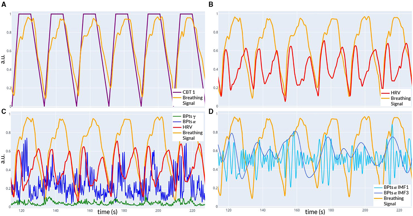Figure 2. Example of signals recorded during CBT 1. All panels show data from the same time window of one trial. (A) Controlled breathing task (CBT 1, purple) that participants were instructed to follow, along with the breathing signal (light orange) recorded from one subject. The Pearson correlation coefficient between these two signals was 0.86. (B) Breathing signal (light orange) and HRV signal (red) from the same subject. (C) The signals from (B), along with the band power time series BPtsα (blue) and BPtsγ (green) from the Cz channel. (D) Breathing signal (light orange), IMF 1 (light blue), and IMF 3 (dark blue) of BPtsα from (C). The Pearson correlation coefficient between the breathing signal and IMF 3 was 0.21.
