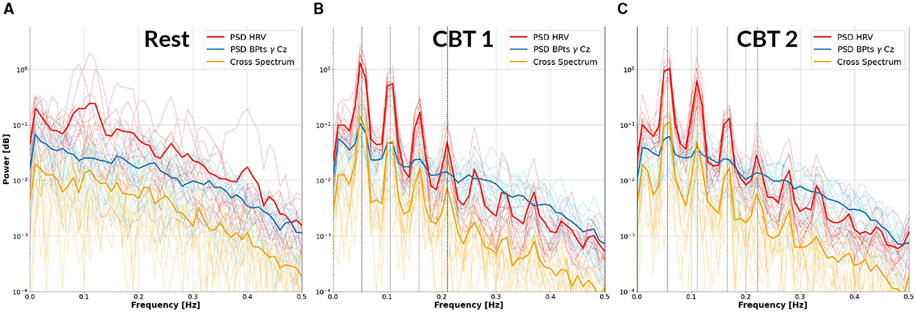 Figure 3. Cross-Spectrum between HRV and BPtsγ at Cz. Each panel displays the mean power spectral density (PSD) of the HRV (red) and BPtsγ at Cz (blue), as well as their cross-spectrum (yellow), averaged across subjects (bold lines). Individual subject traces are shown as fine lines. (A) Results for Rest. (B) Results for CBT 1. Vertical lines mark the frequency of CBT 1 (19-second breathing cycles, i.e., 0.0526 Hz) and its following three harmonics. (C) Results for CBT 2, with vertical lines marking the frequency of CBT 2 (18-second breathing cycles, i.e., 0.0555 Hz) and its following three harmonics. In both (B, C), all signals show peak power at the respective fundamental frequency, followed by progressively smaller peaks at subsequent harmonics.