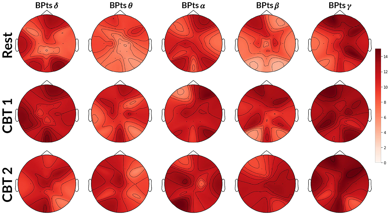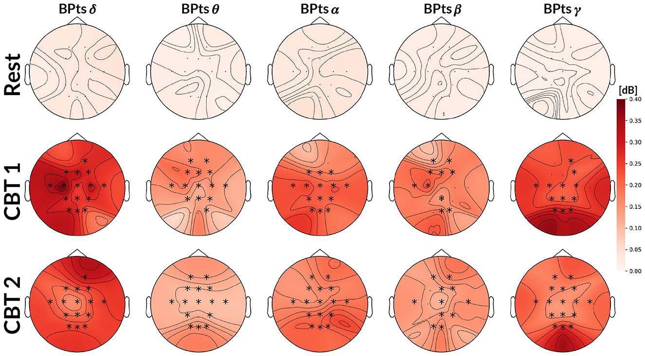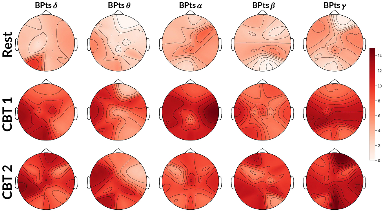 Mean BPts increased in the δ, β, and γ bands during both CBTs across nearly all channels when compared to Rest, as shown in Tables 1, 2. However, these differences were only significant for BPtsβ at P3 and Pz for both CBTs; and for BPtsγ at Pz for both CBTs, and at Cz, T7, P3, P4, O1 and O2, for CBT 1. In contrast, for CBT 1, significant decreases in mean BPts were observed in the θ and α bands from central through occipital channels, excluding Pz. For CBT 2, significant decreases were found in BPtsθ at T7 and in BPtsα at P3, P4, Oz, O1 and O2.