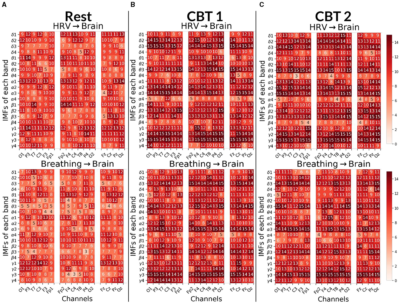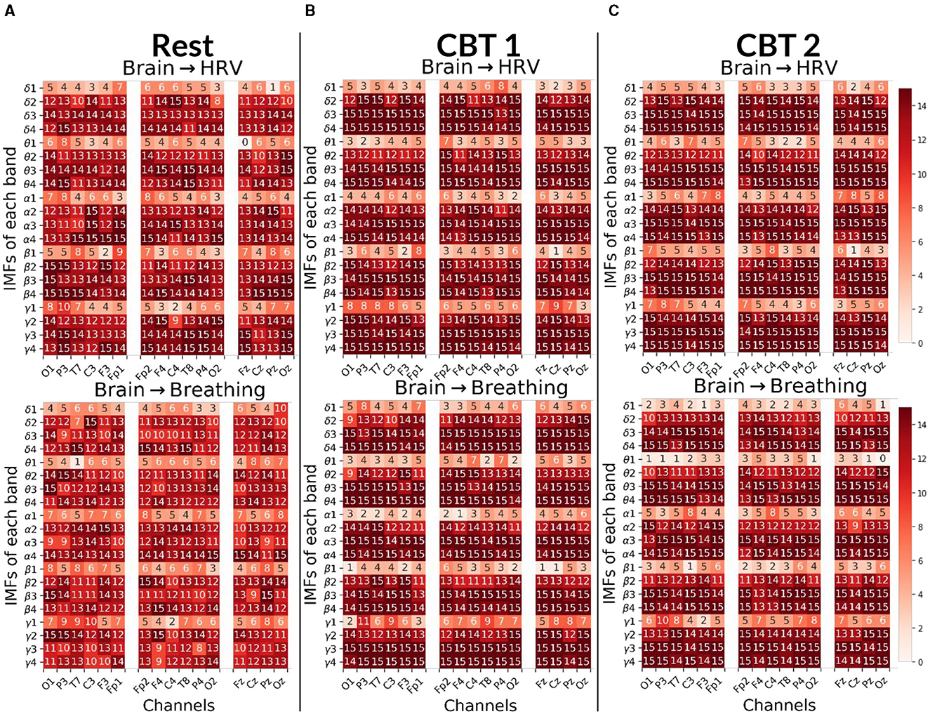 Figure 7. Brain→Body Granger causality tests. Each panel displays the number of subjects (maximum 15) with positive G-causal relationships from each intrinsic mode function (IMF), per frequency band and channel, to either the HRV (top) or breathing (bottom) signal. In the first column, channels are ordered from occipital to frontal along the left hemisphere; in the second column, from frontal to occipital along the right hemisphere; and in the third column, from frontal to occipital along the midline. (A) Results for Rest. (B) Results for CBT 1. (C) Results for CBT 2. Compared to Rest, both CBT 1 and CBT 2 showed increased G-causal relationships for IMFs 3 and 4 across all frequency bands.