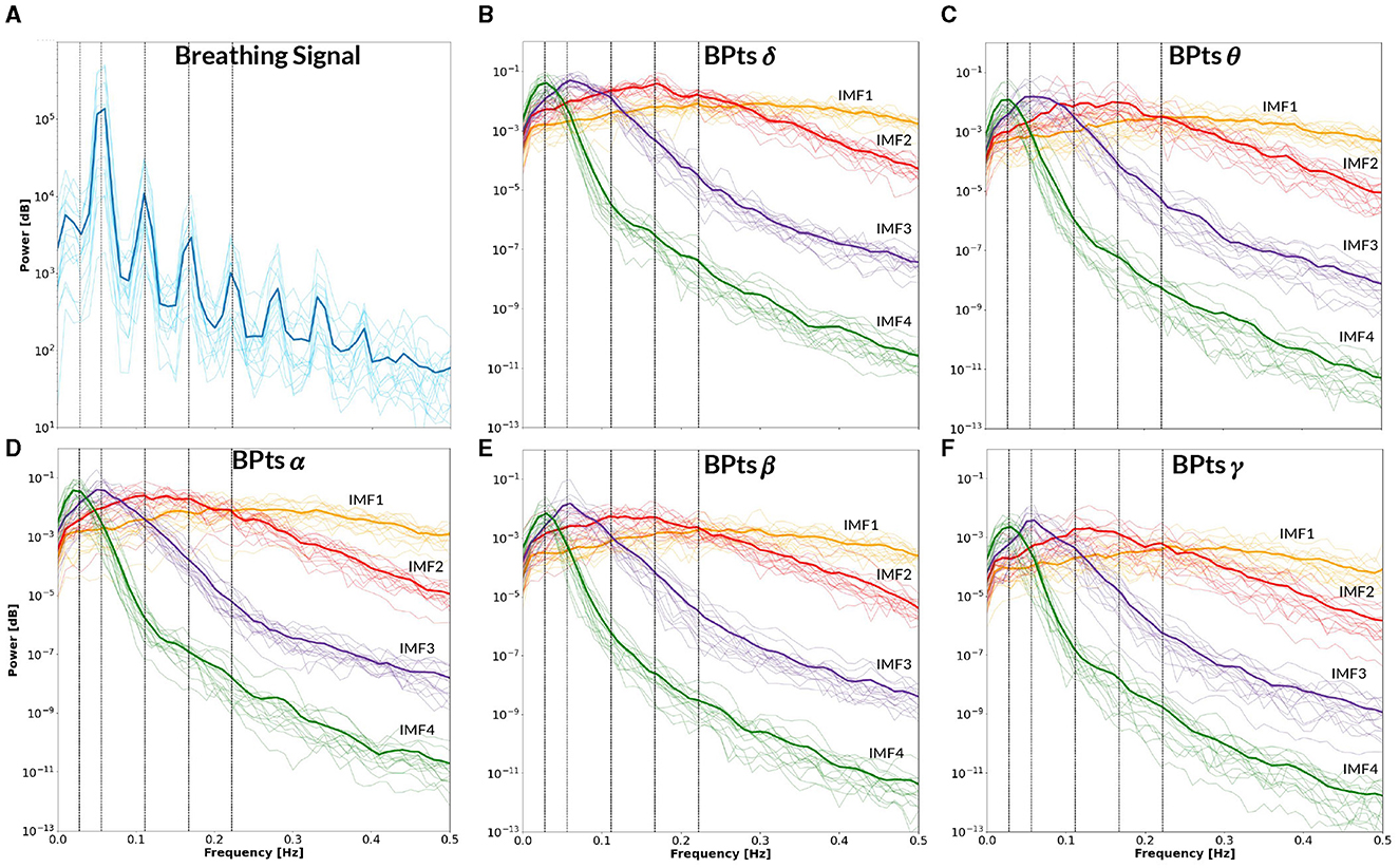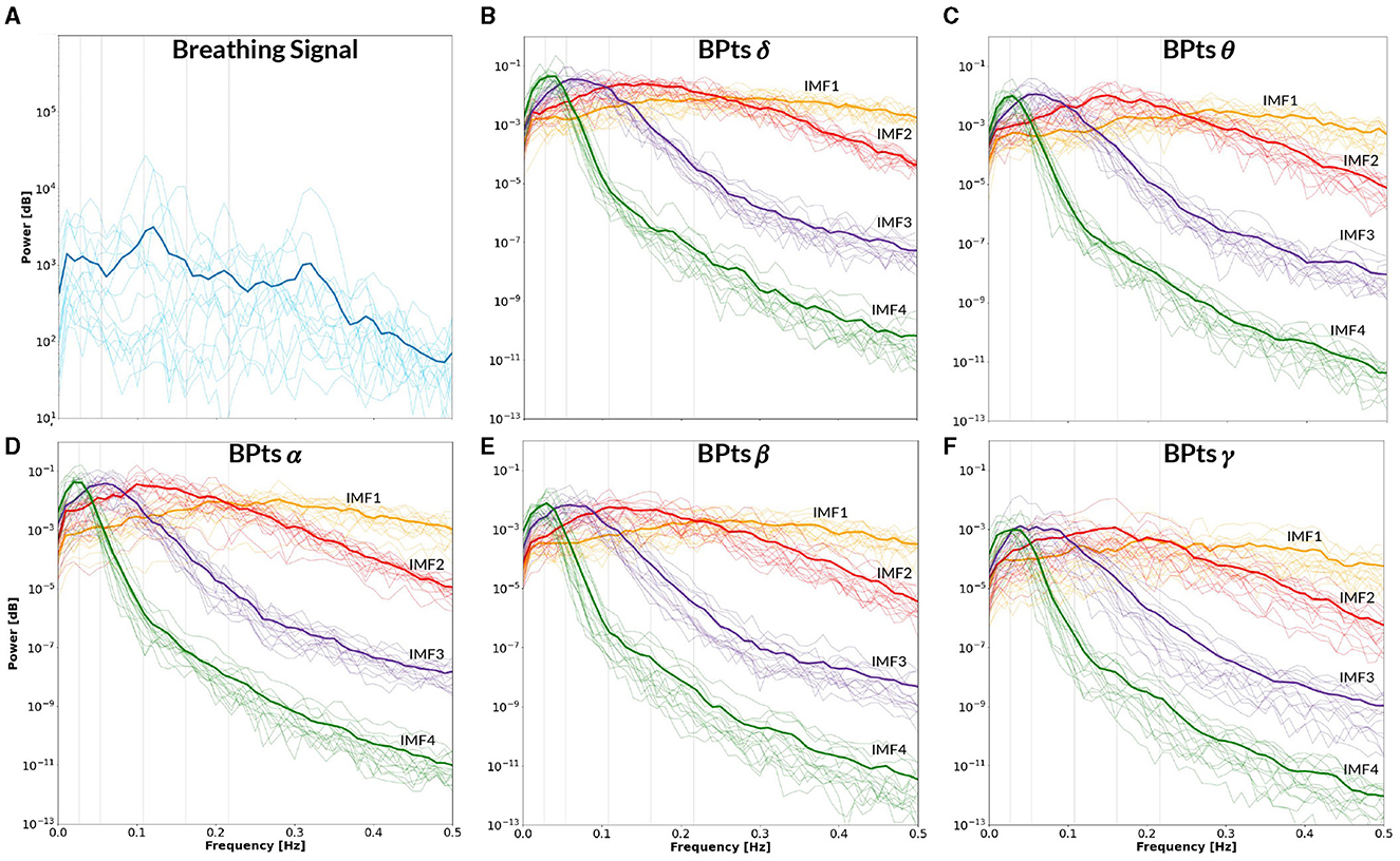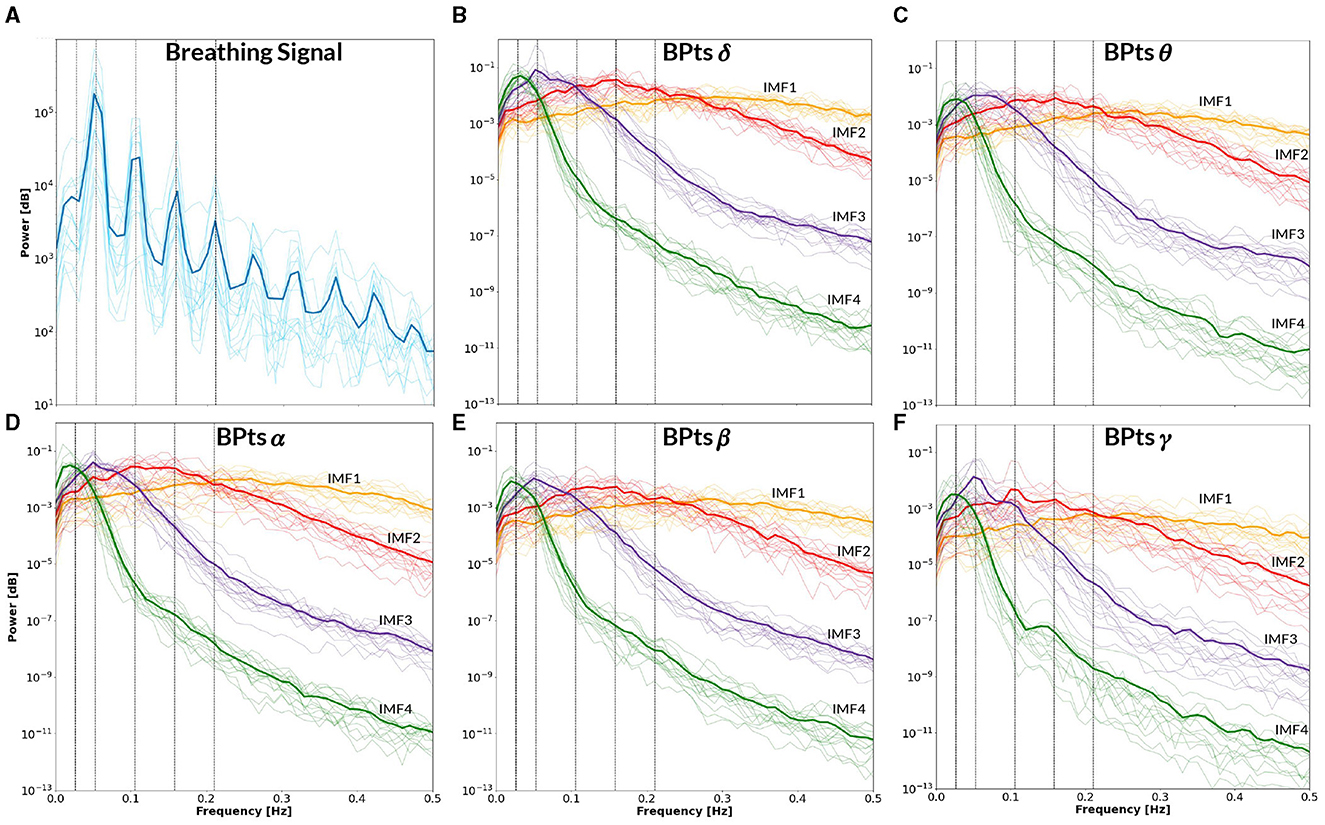 Figure 9. Power spectral density–CBT 1. All panels display the mean power spectral density (PSD) averaged across subjects (bold lines), with individual subject PSDs shown as finer lines. (A) PSD of the breathing signal (blue), where the highest peak occurs at the fundamental frequency, followed by smaller peaks at subsequent harmonics. Vertical lines indicate the frequency of CBT 1 (19-second breathing cycles, i.e. 0.0526 Hz) and its half, second, third and fourth harmonics. (B–F) Show the PSD of the band power time series (BPts) for each frequency band and intrinsic mode function (IMF 1 in yellow, IMF 2 in red, IMF 3 in purple, IMF 4 in green). (B) PSD BPtsδ. (C) PSD BPtsθ. (D) PSD BPtsα. (E) PSD BPtsβ. (F) PSD BPtsγ. For all bands, IMF 4 centers around the half harmonic, while IMF 3 is centered at the fundamental frequency. Additionally, IMF 3 shows a prominent peak at the breathing frequency in all bands except θ, while IMF 2 shows a smaller peak at the second harmonic exclusively in γ. Notably, IMF 4 in the γ band also exhibits a secondary peak around ~0.15 Hz.