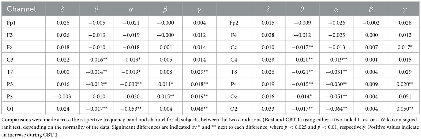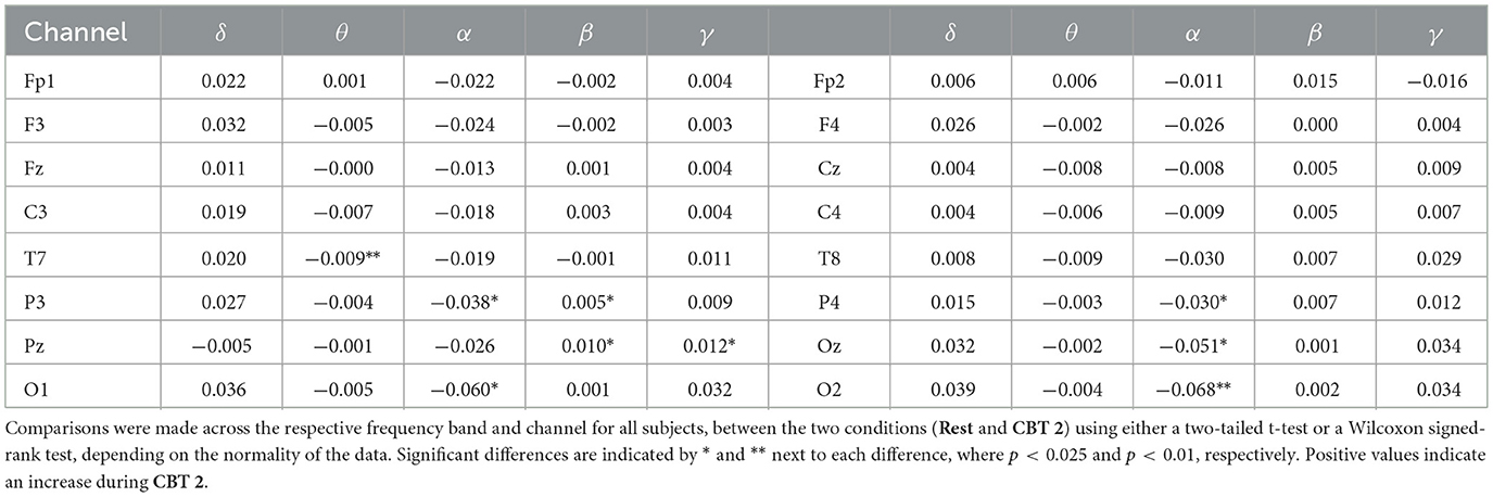 To assess whether significant changes in band power occurred during the CBTs, between Rest vs CBT1 and Rest vs CBT2, Shapiro-Walk normality tests were conducted on the data from all subjects, for each band and channel. For each pair of groups (different condition, same band and channel) with normal distributions, a parametric two-tailed t-test was performed. If normality was rejected for one of the groups, a Wilcoxon signed-rank test was used instead. The significance level for all statistical tests was set at 0.025, following a Bonferroni correction to account for multiple comparisons across the different conditions.